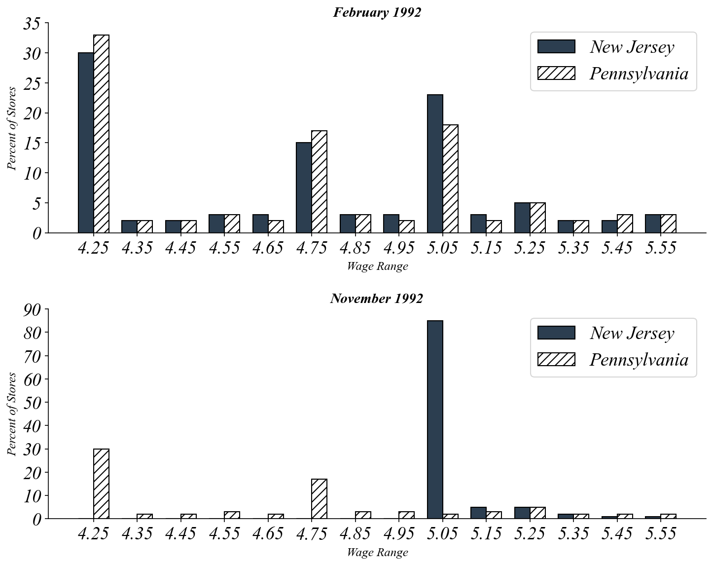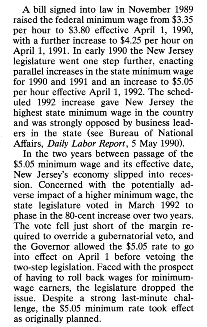“Contrary to the central prediction of the textbook model… we find no evidence that the rise in New Jersey’s minimum wage reduced employment.”