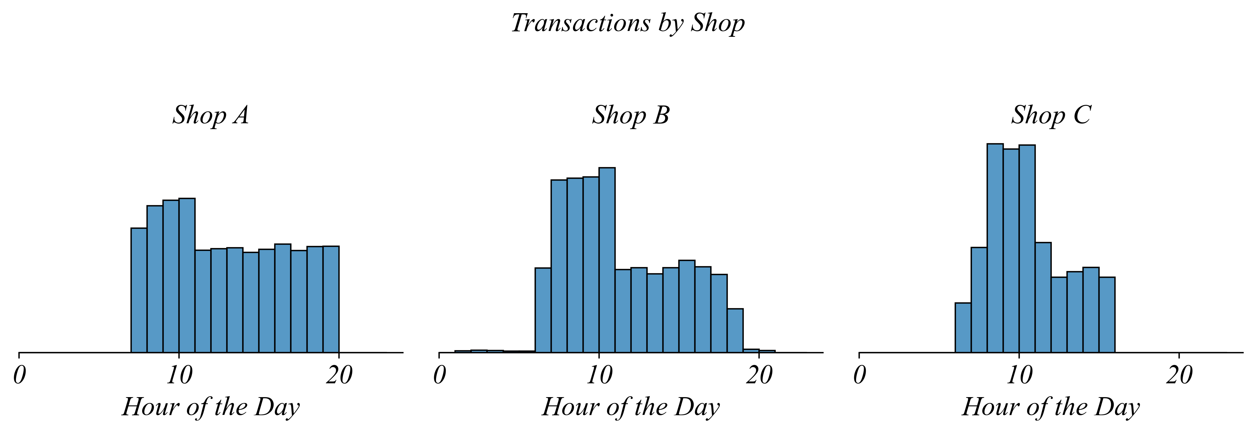 | ENCODE | Hour → x-position; Count → y-position; Shop → color/facet |