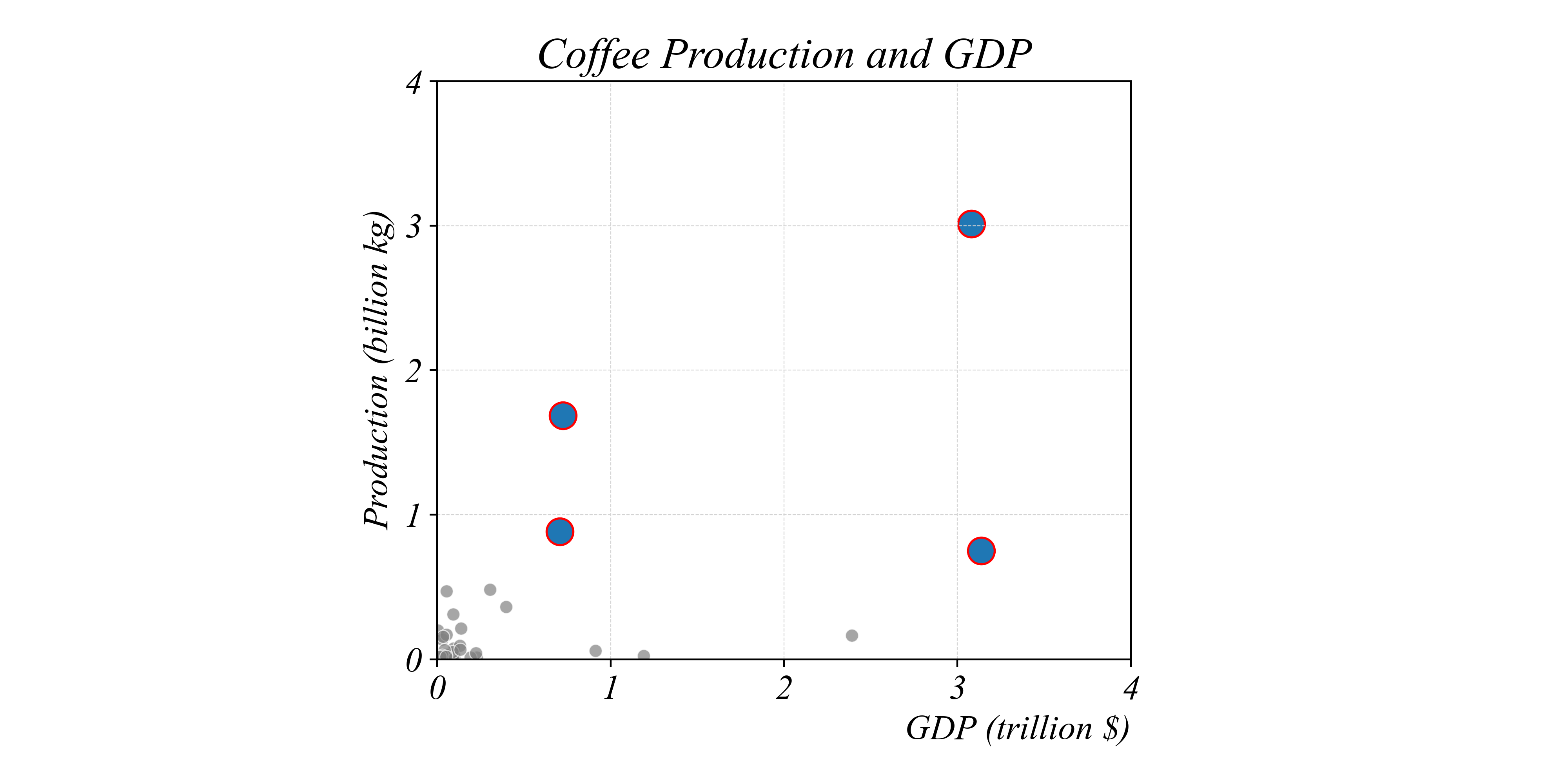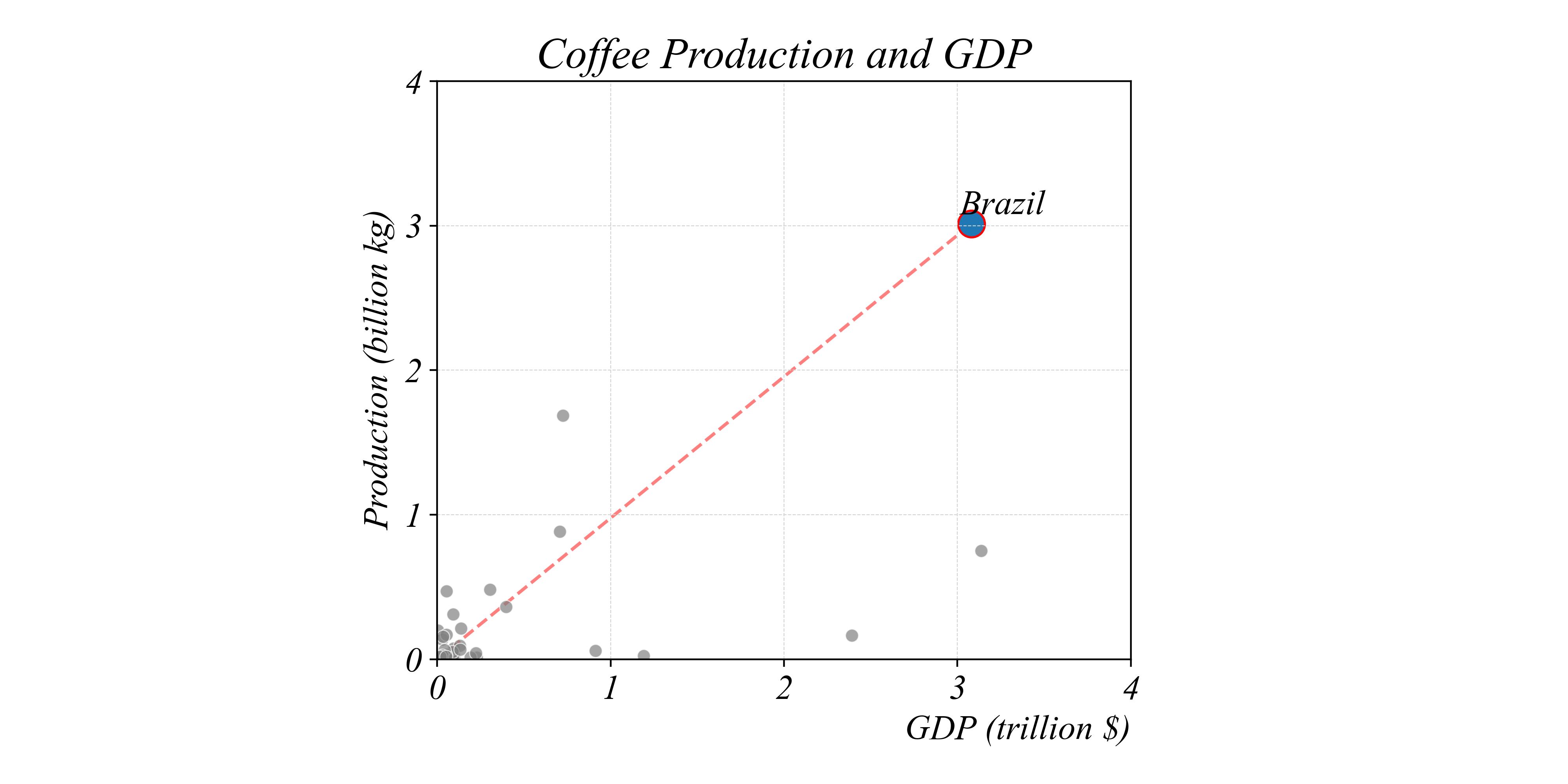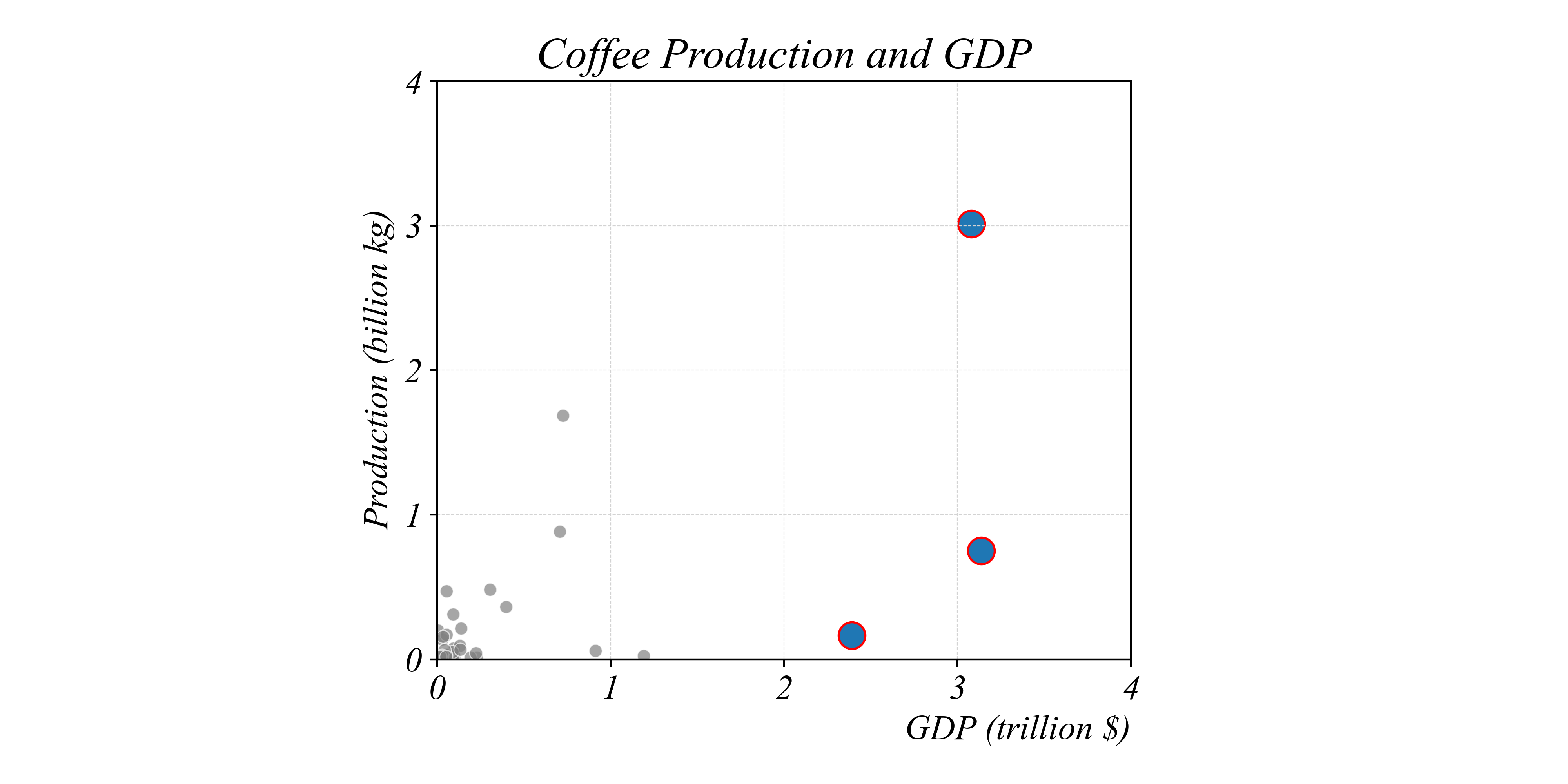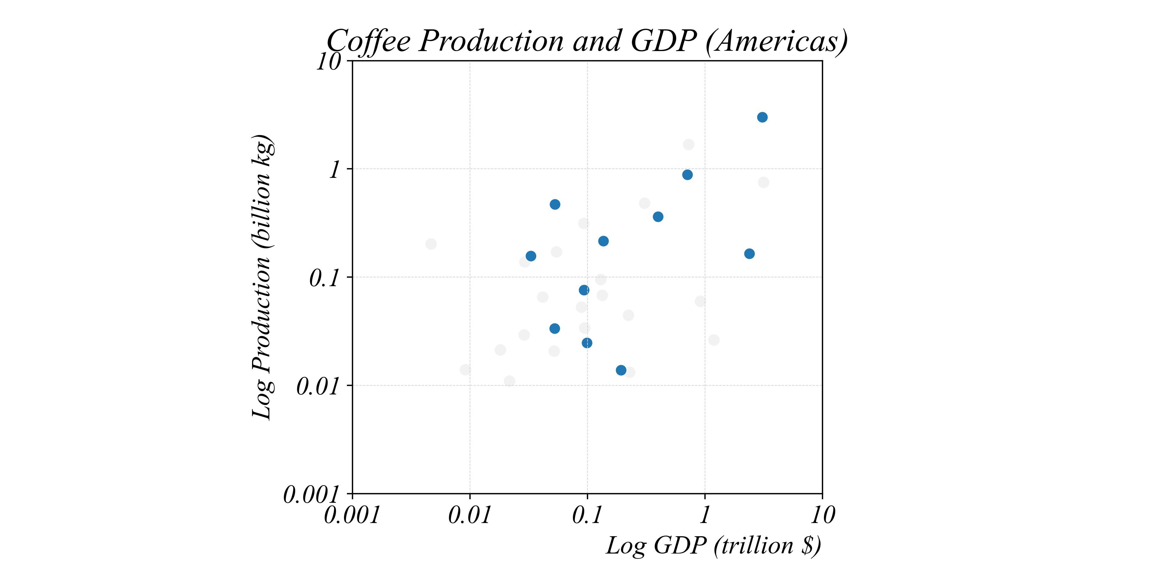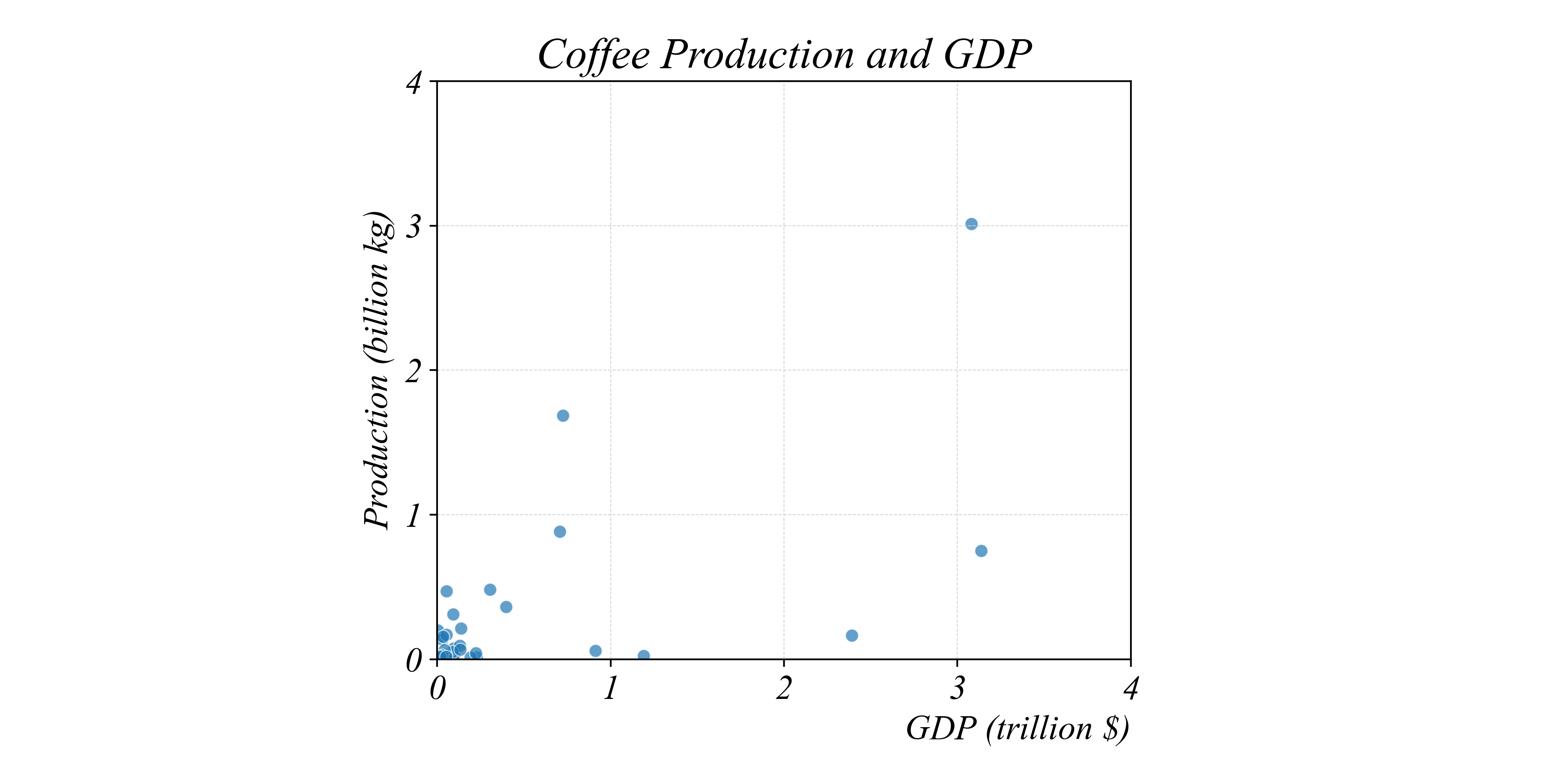 We’re going to use a scatterplot to visually examine the relationship between coffee production and GDP.