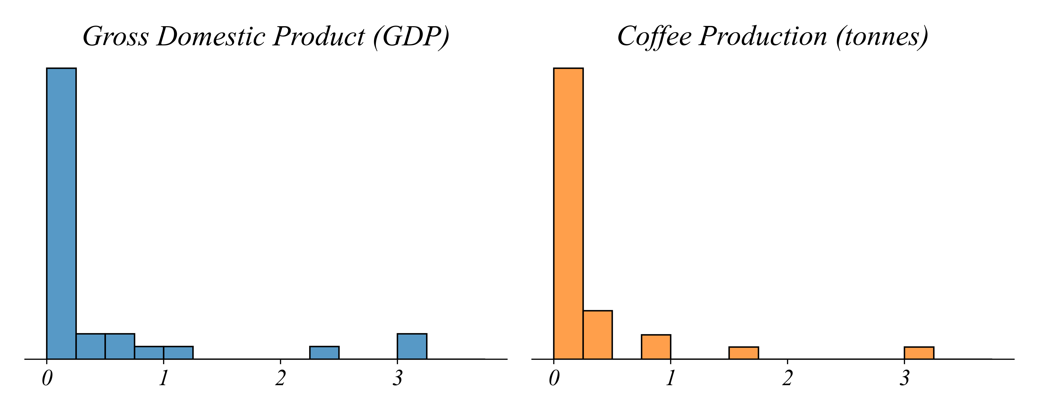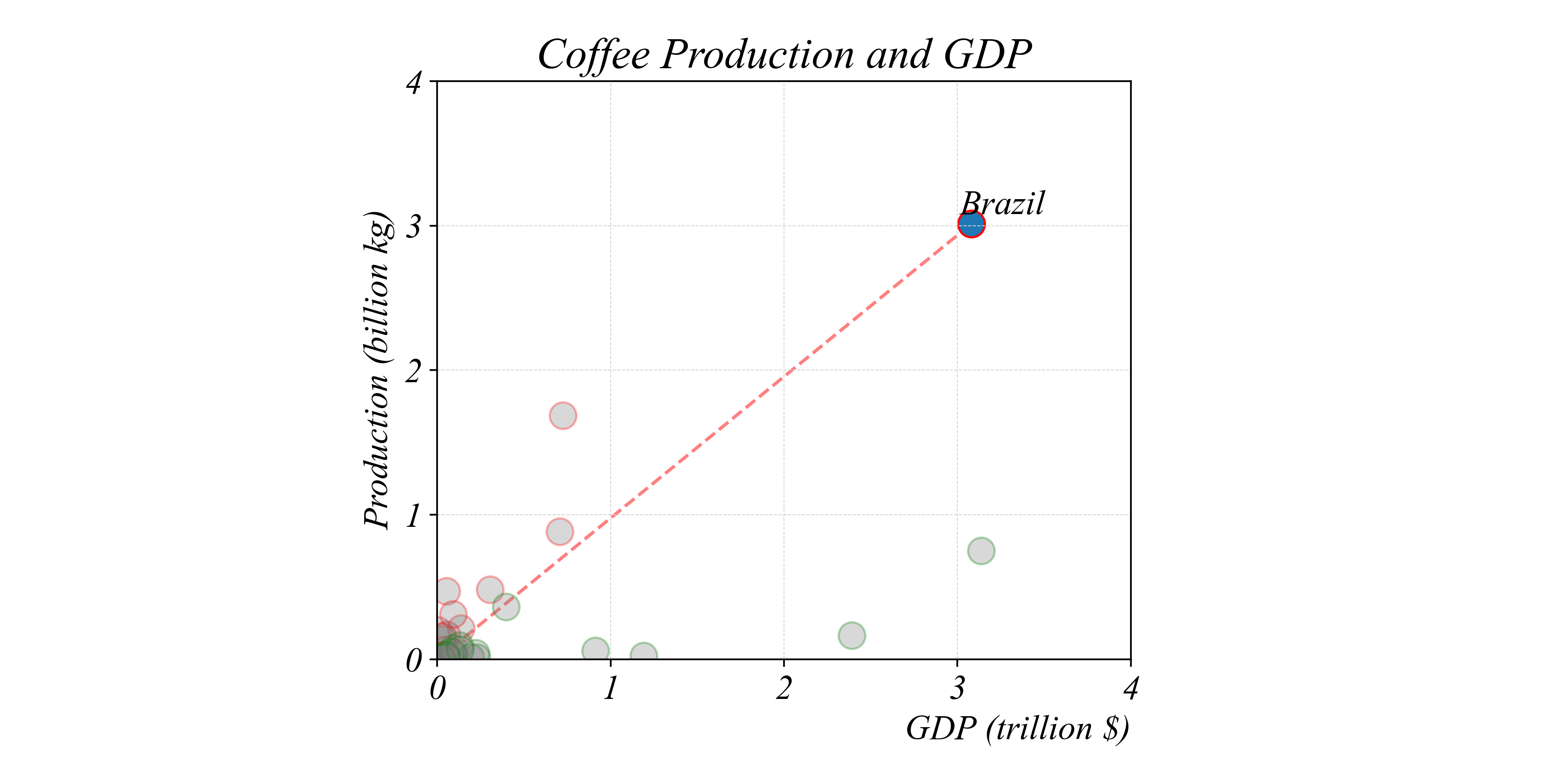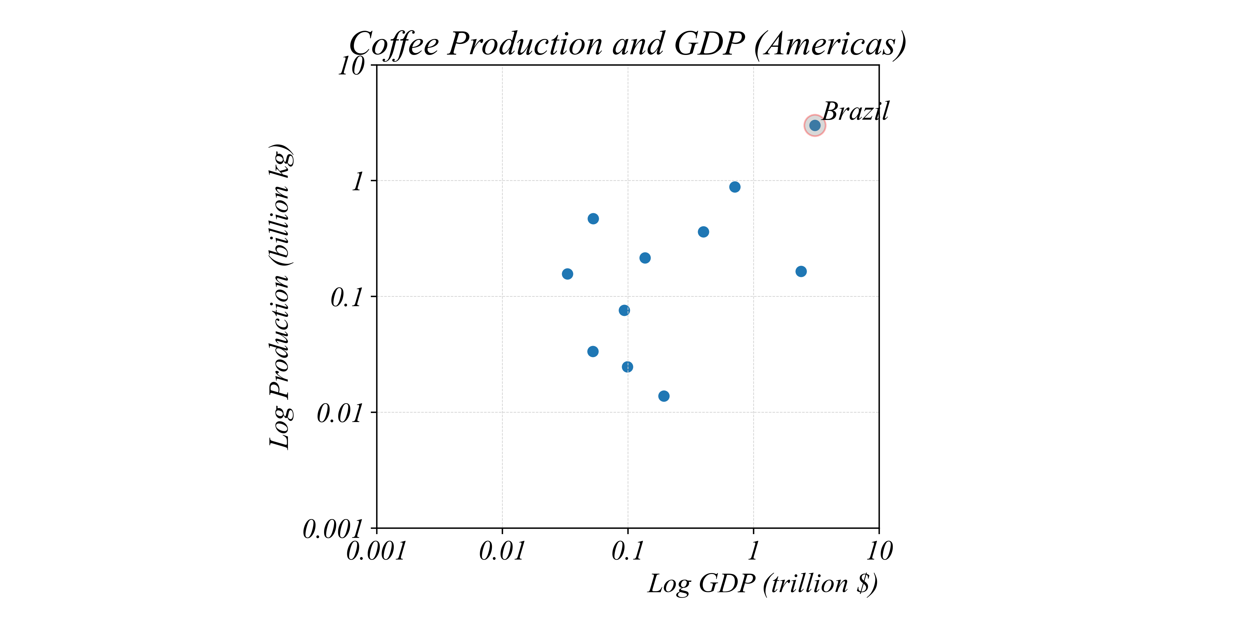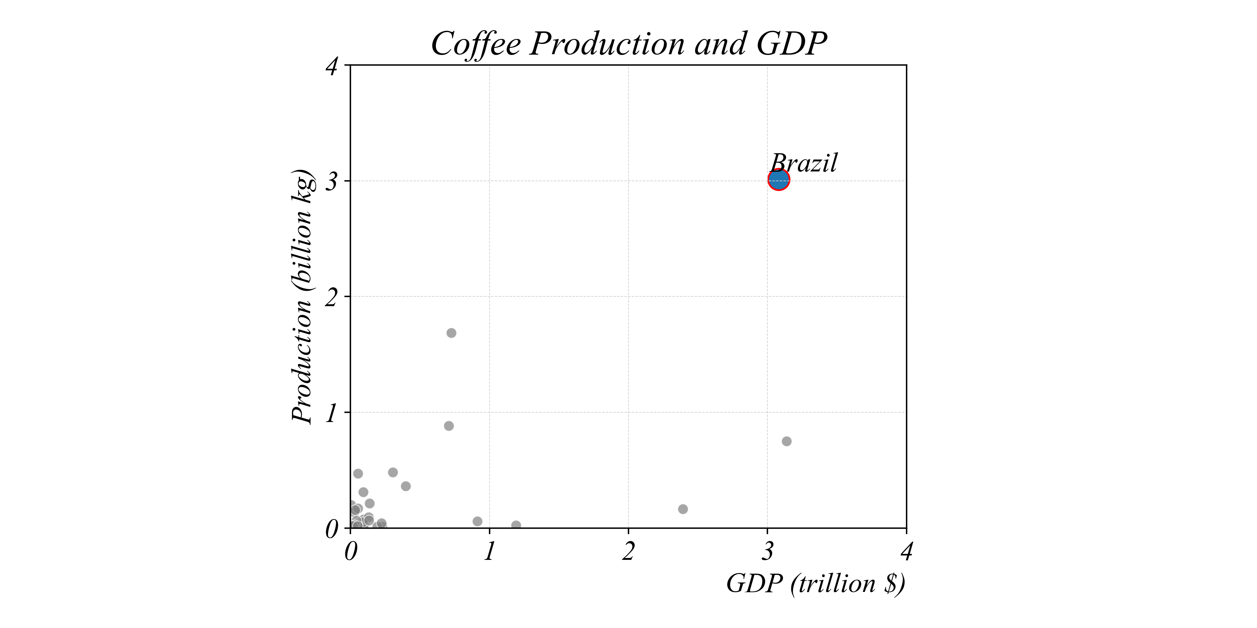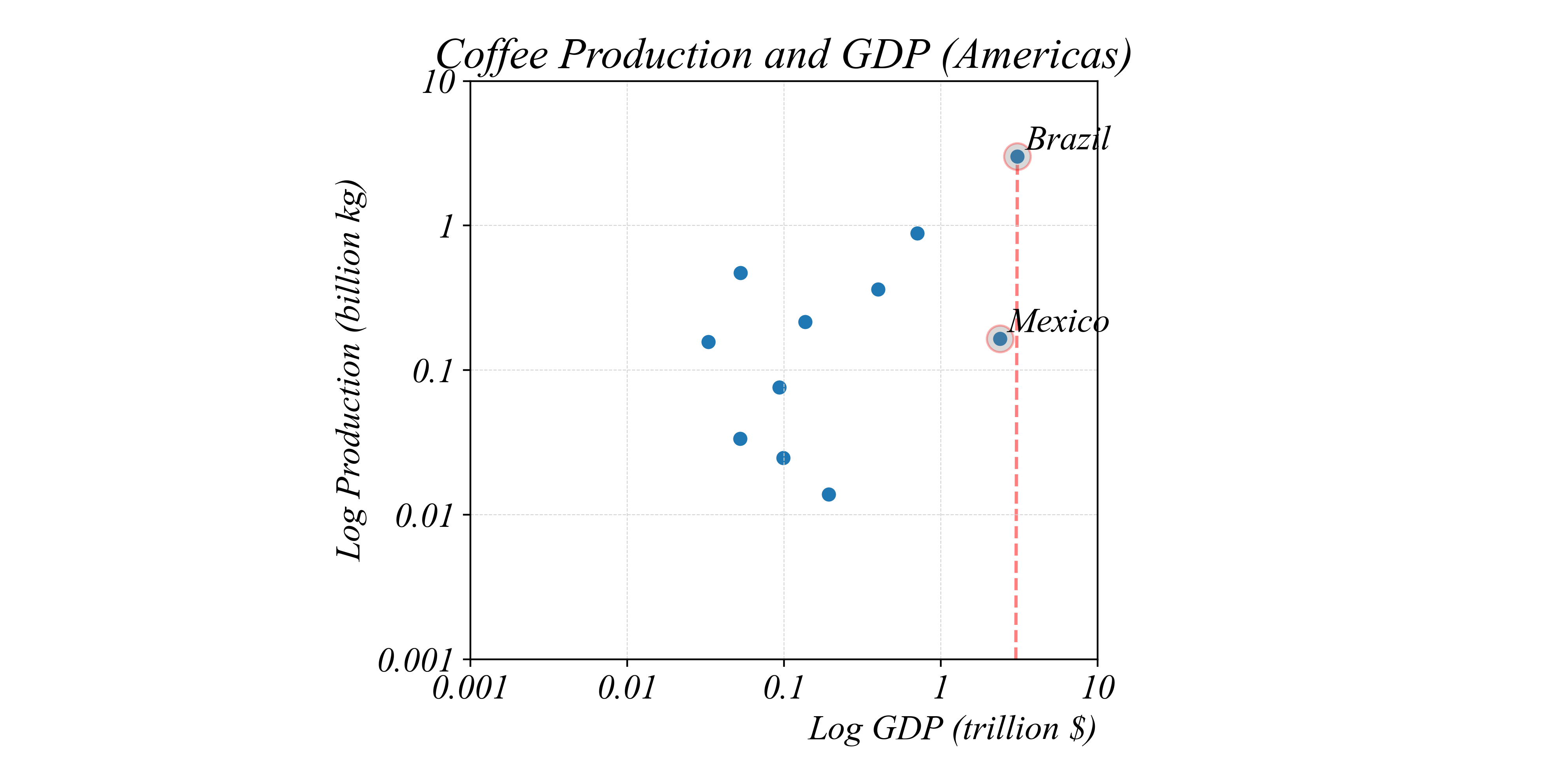 We’re going to use a scatterplot to visually examine the relationship between coffee production and GDP.
