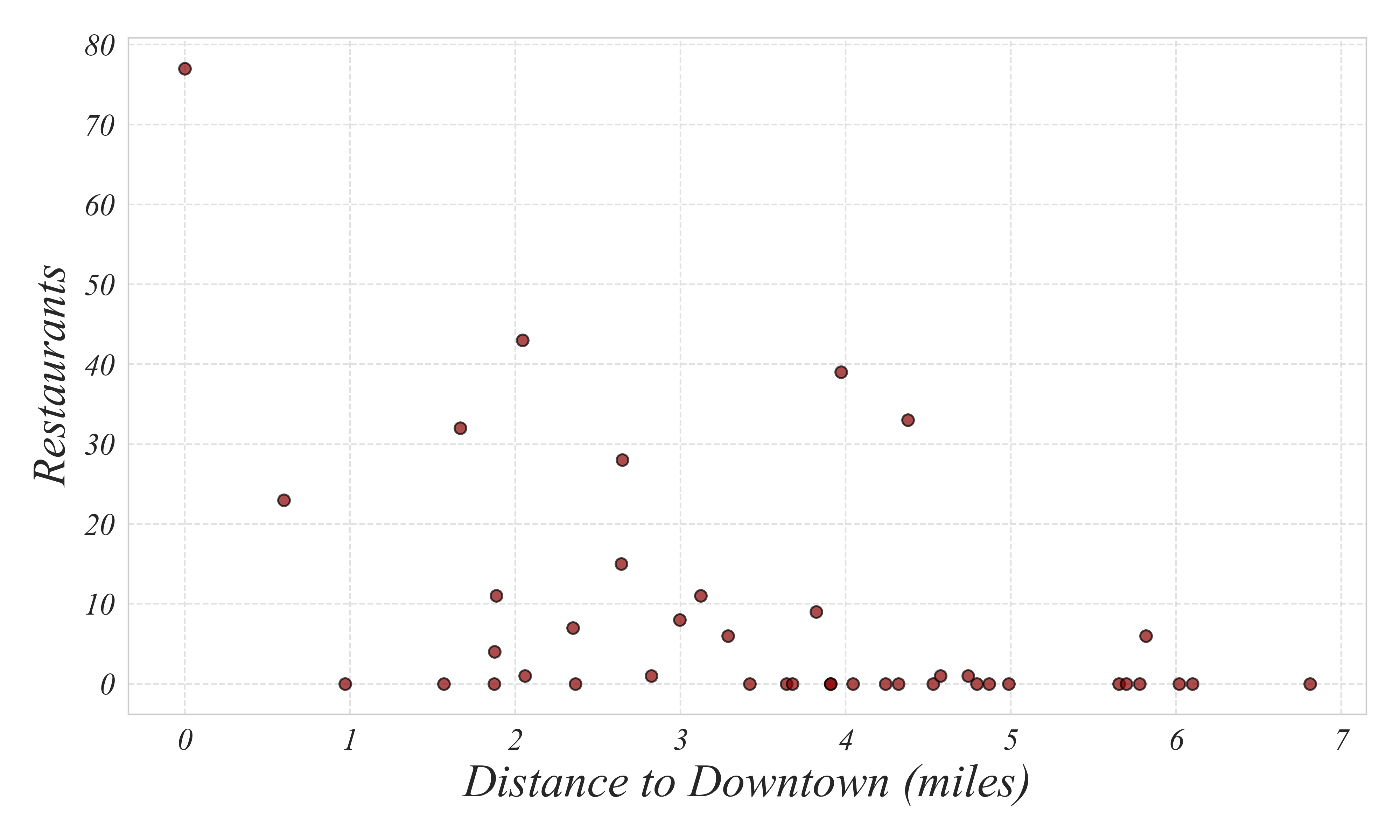 Are there fewer restaurants in areas further from downtown Pittsburgh?