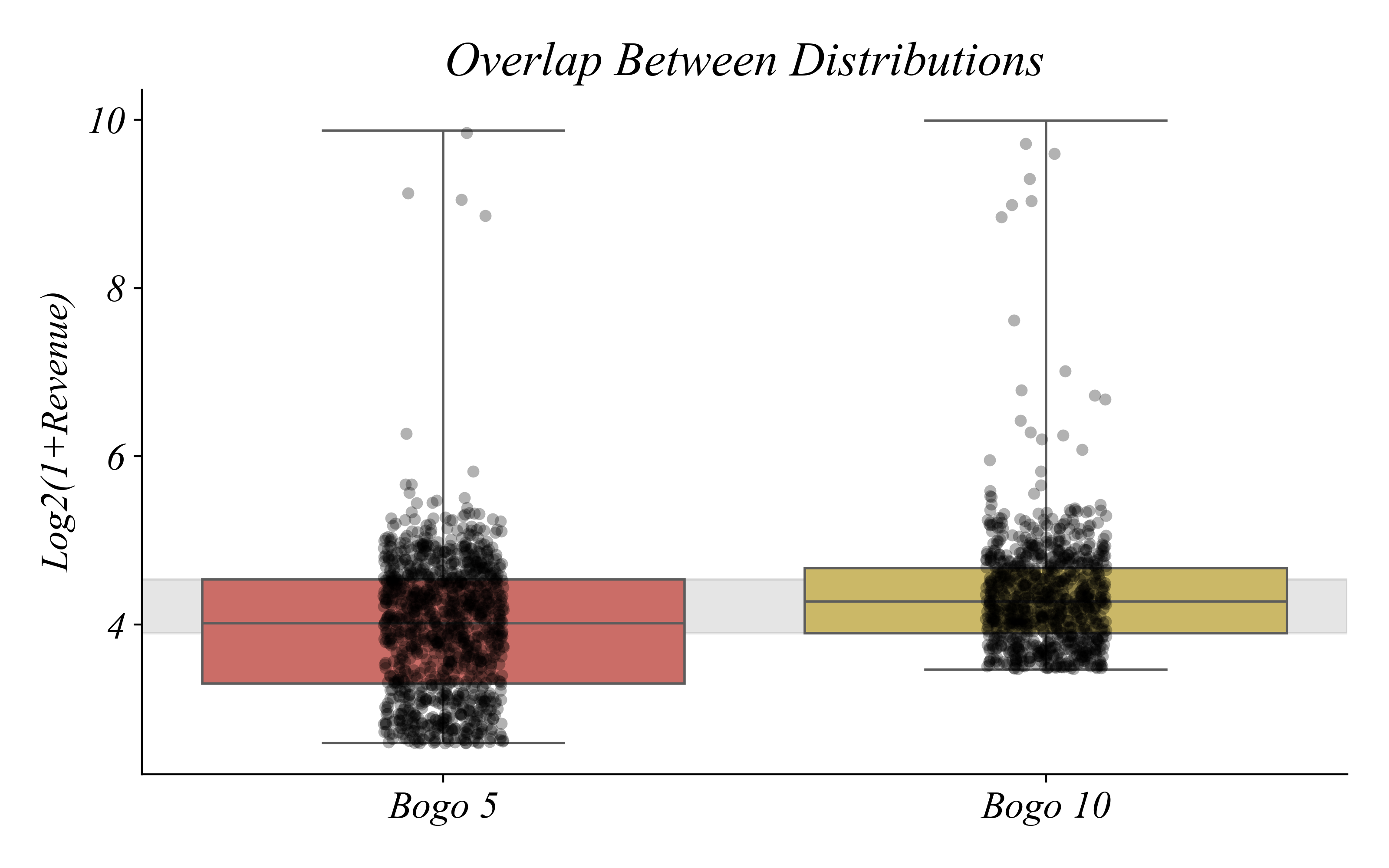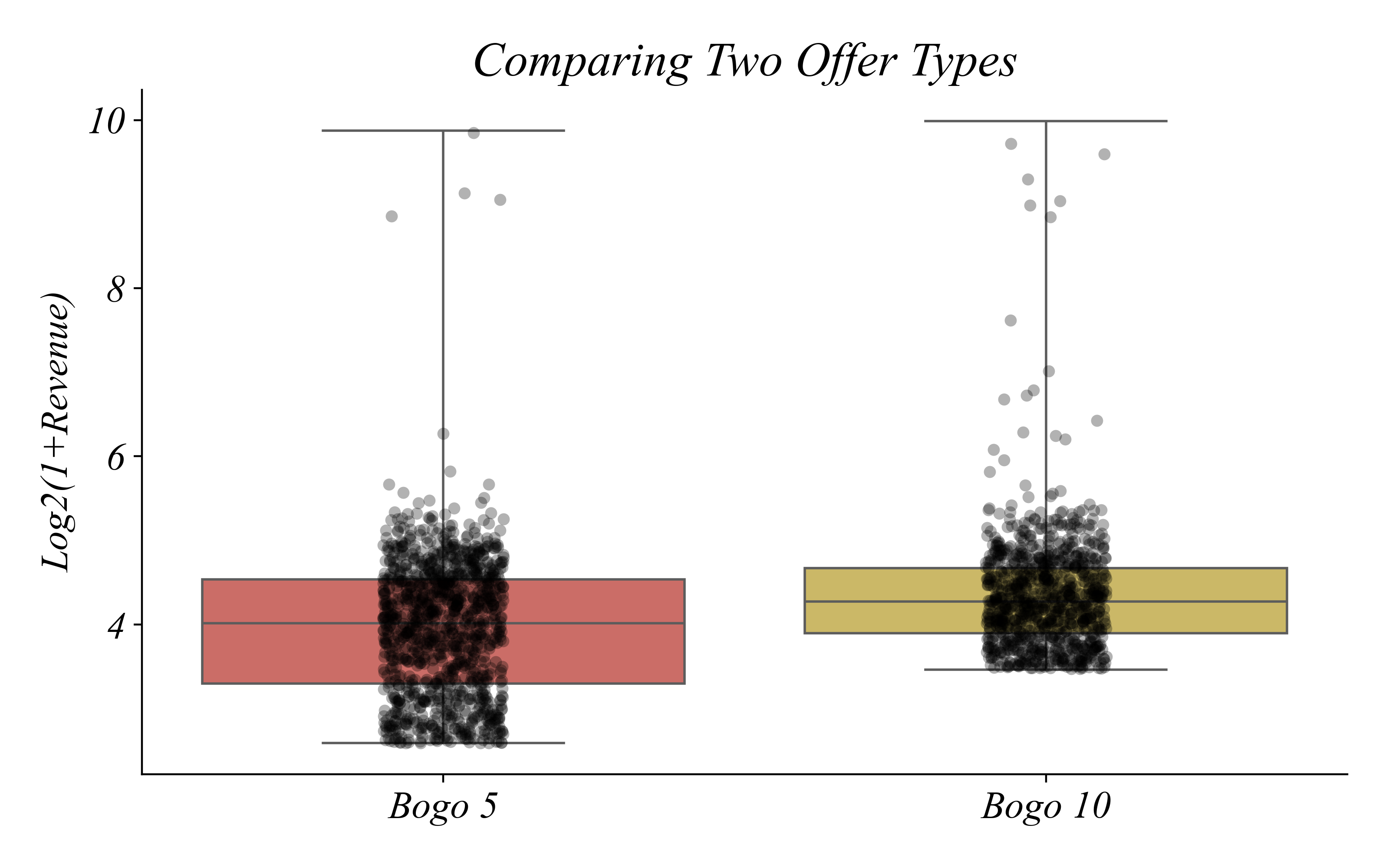 Filter for just Bogo 5 and Bogo 10, then create a boxplot to compare them.