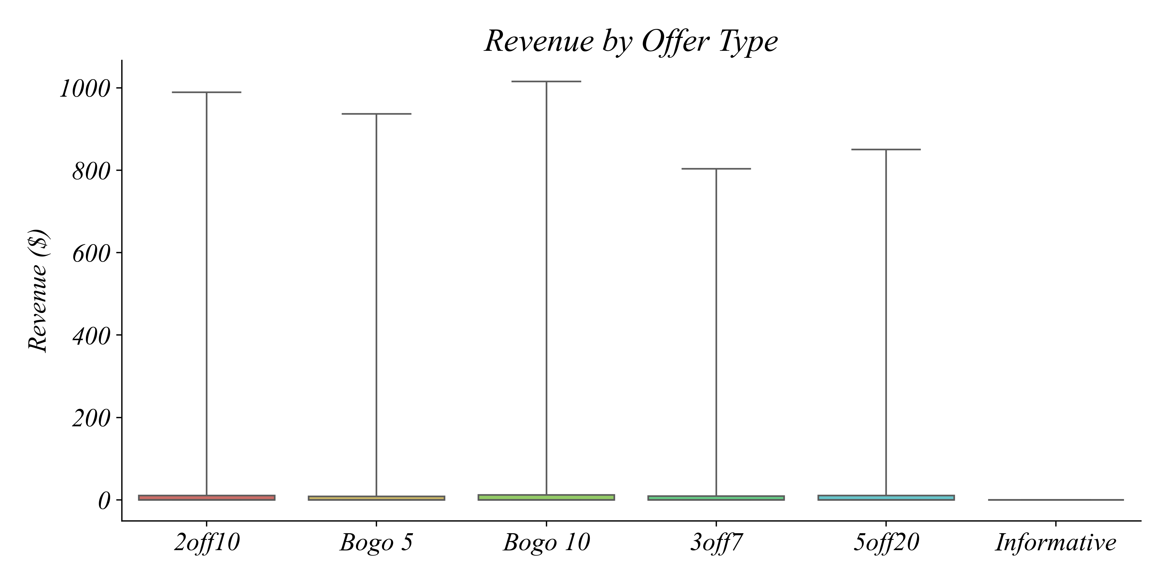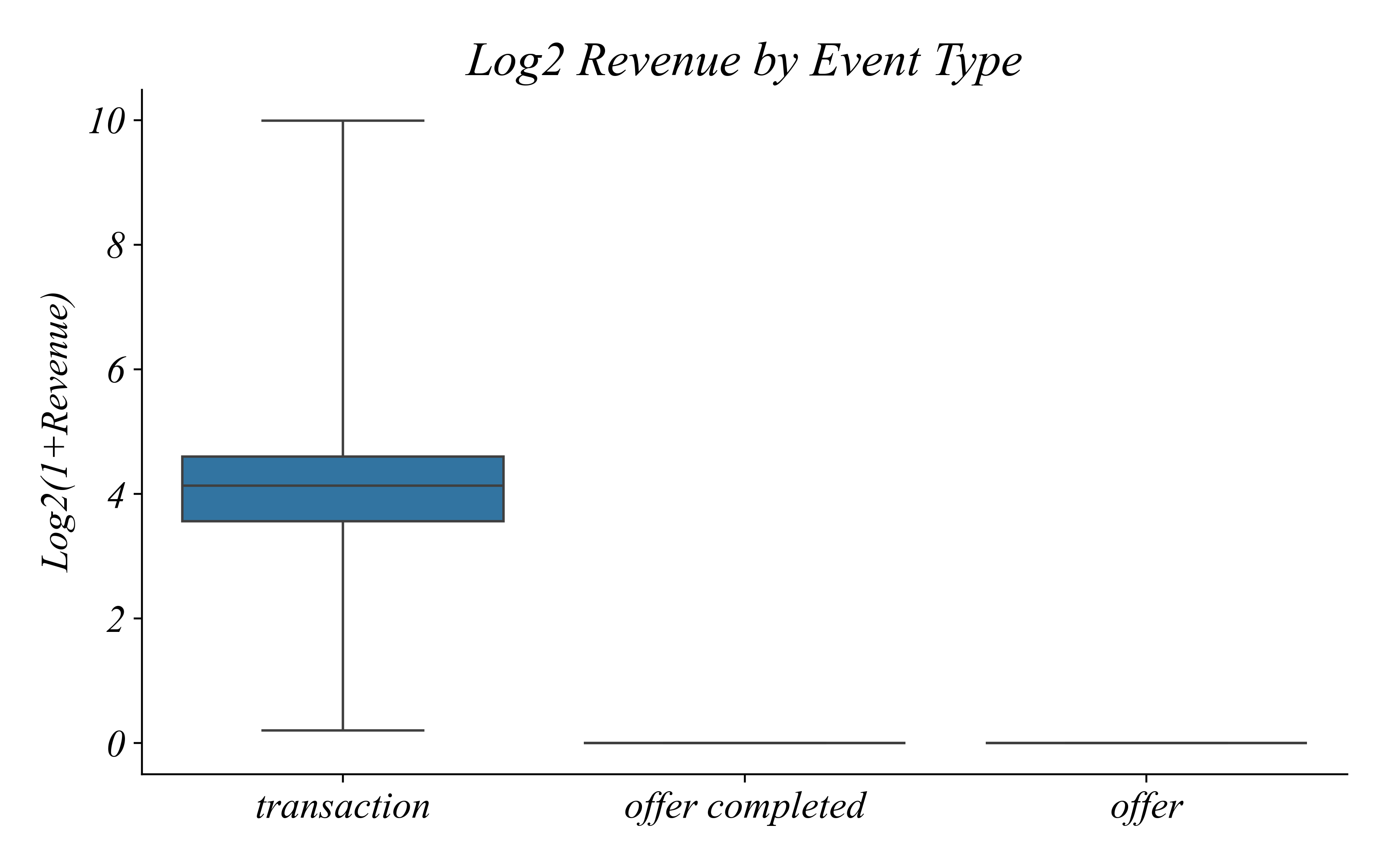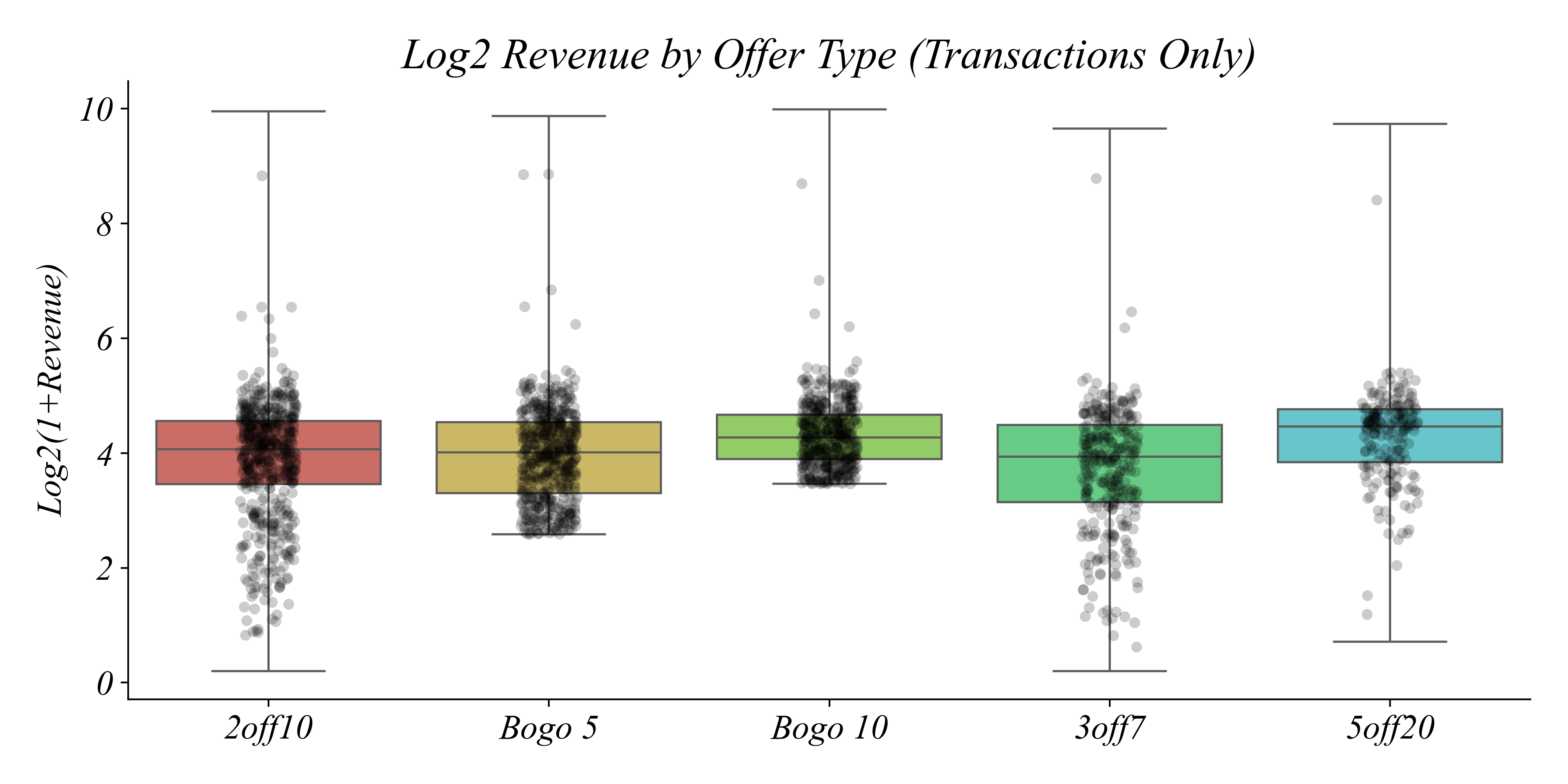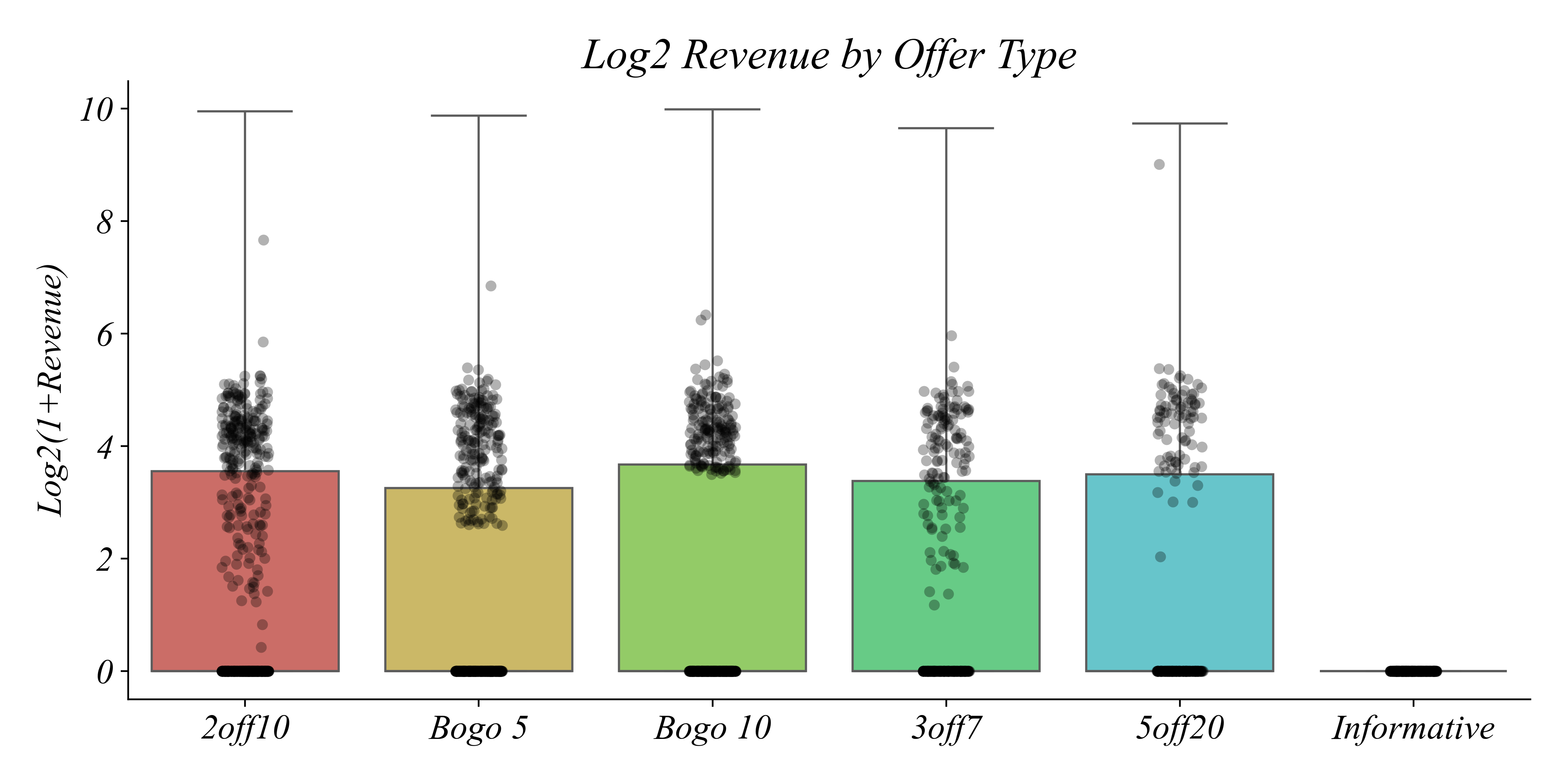 Calculate the mean, standard deviation, and count of log revenue by offer type.