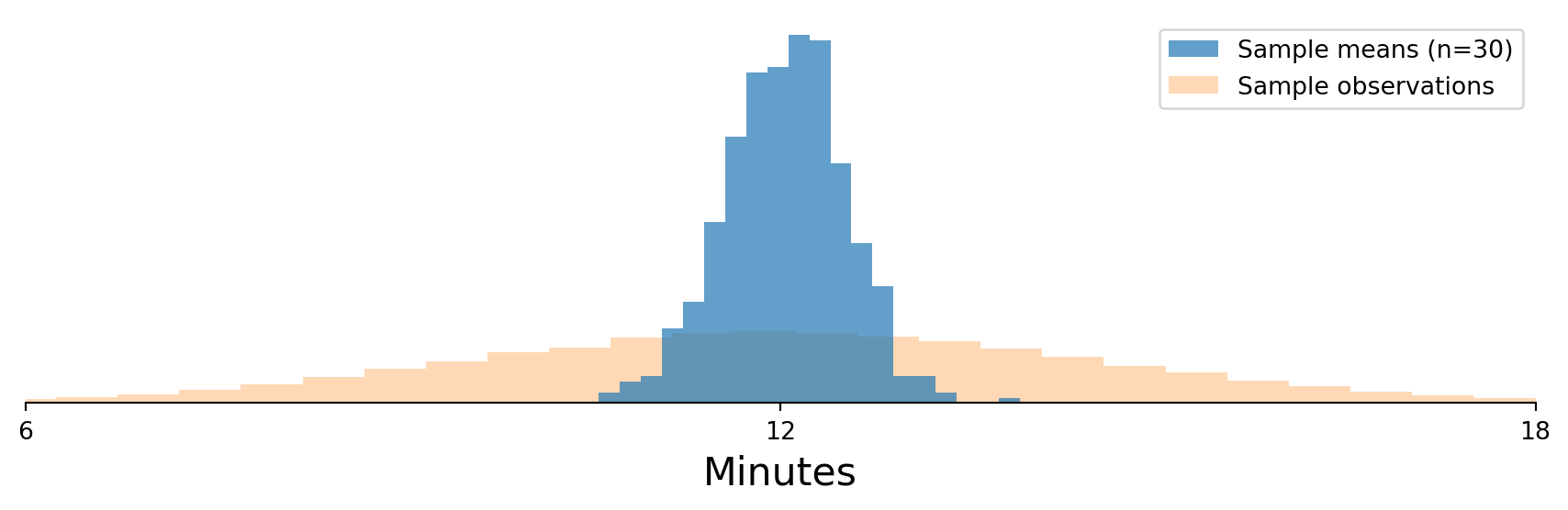 If we take multiple samples, their means will vary, and by much less than the original distribution.