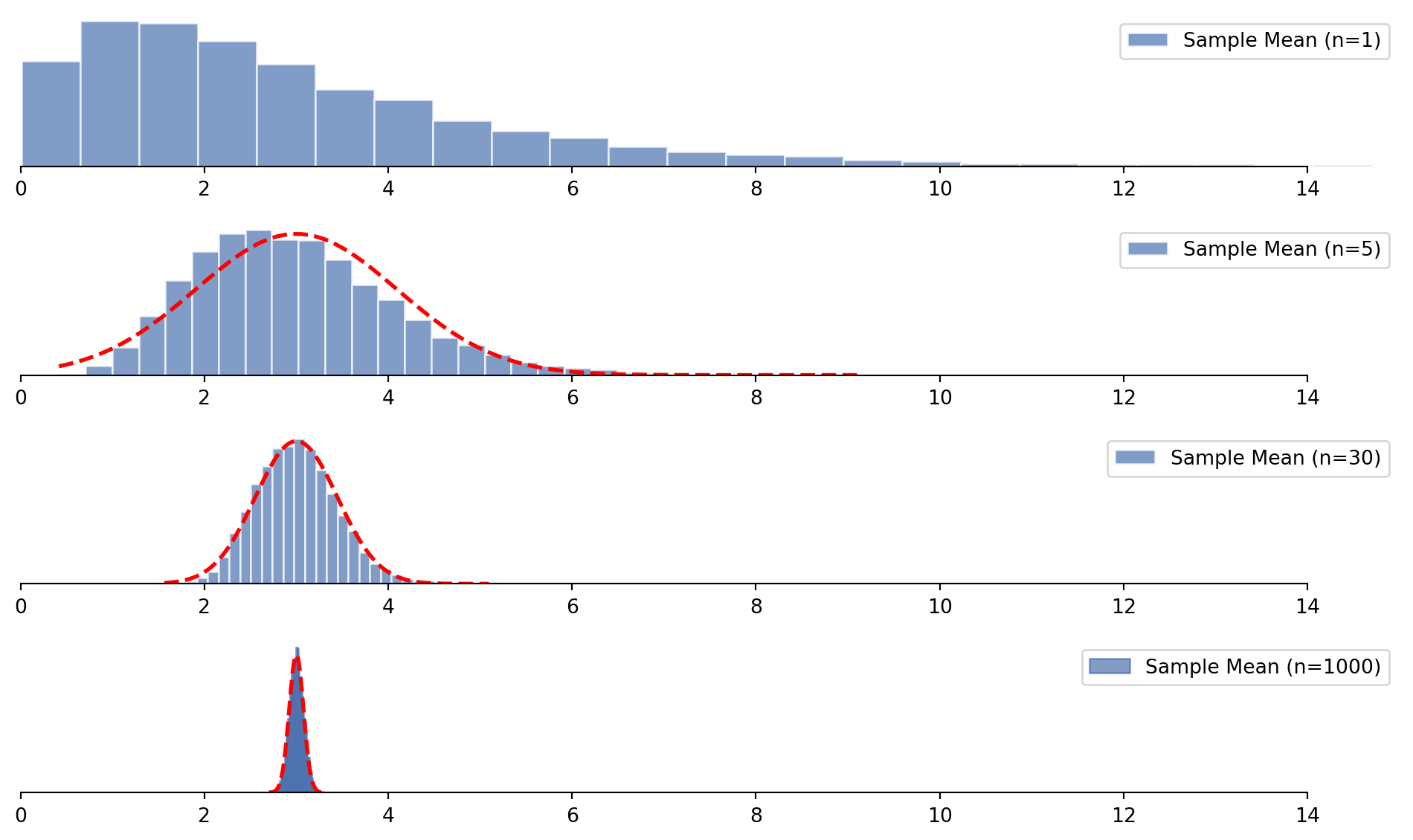 The distribution of sample means approximates a normal distribution as sample size increases, regardless of the population’s distribution.