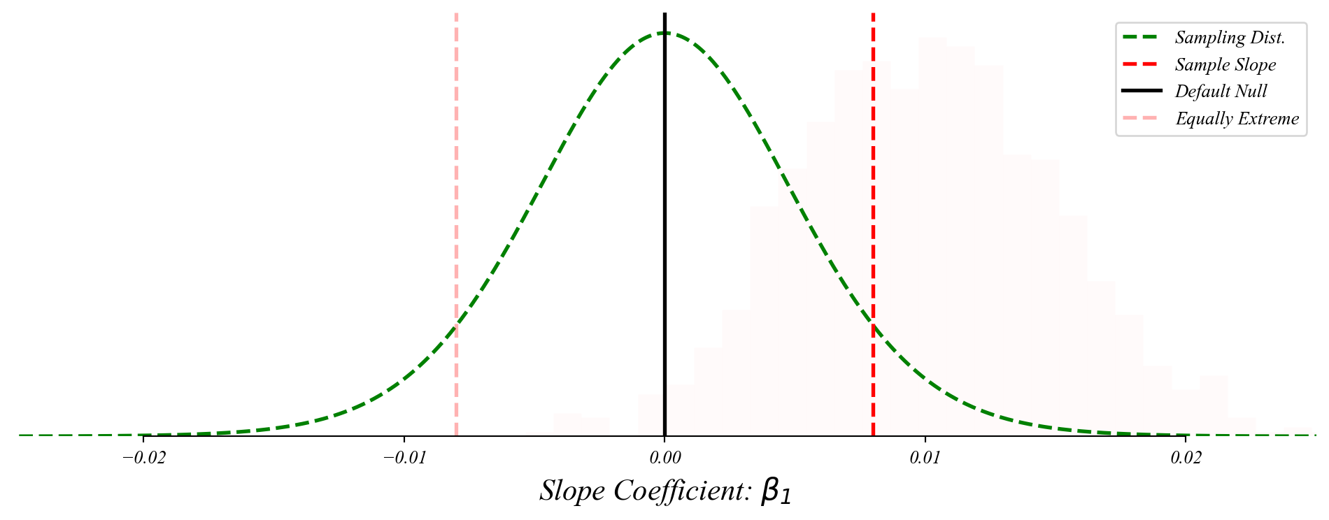 > p-value: the probability a slope as extreme as ours under the null (\(\beta_1=0\))