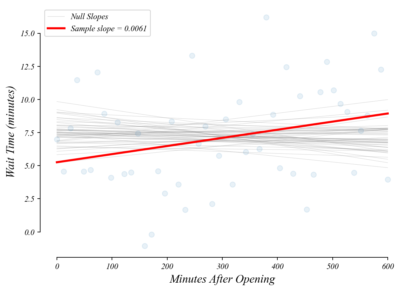 Many possible models we might observe by chance if the null (\(\beta_1 = 0\)) were true.