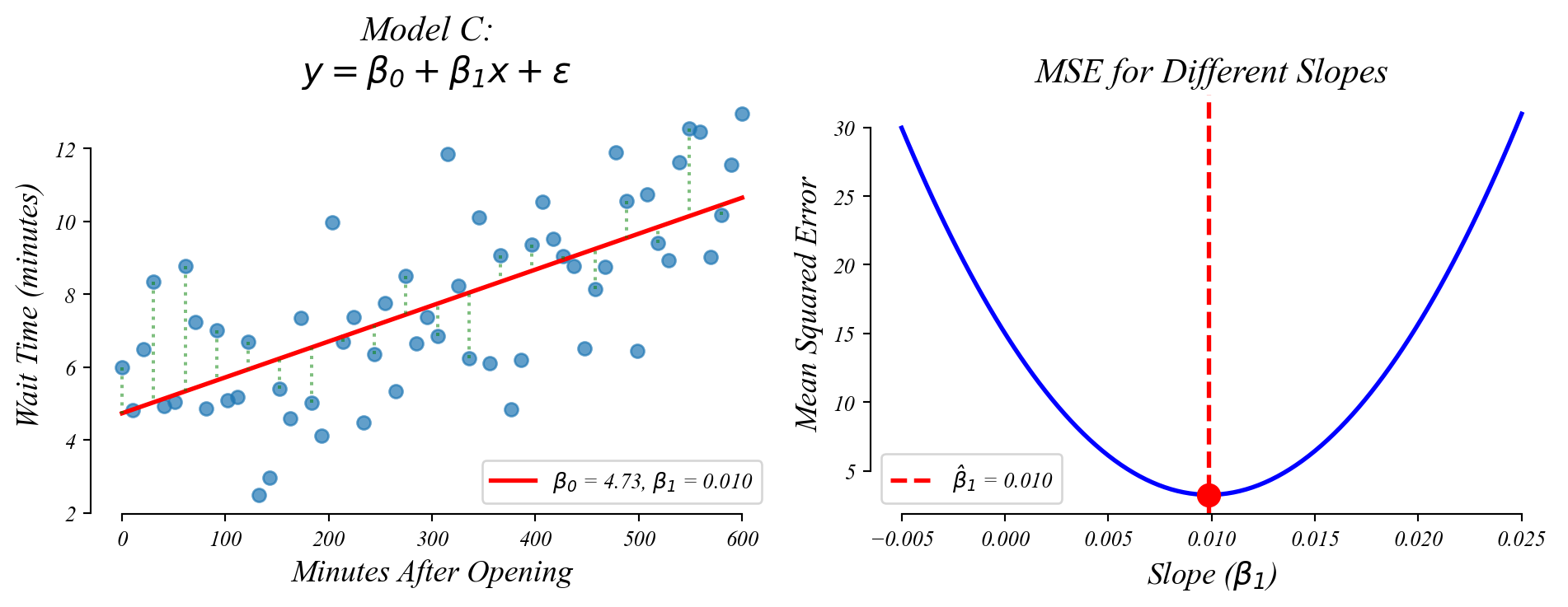 > a slope (β₁) improves model fit (MSE; ‘wrongness’) when there’s a relationship