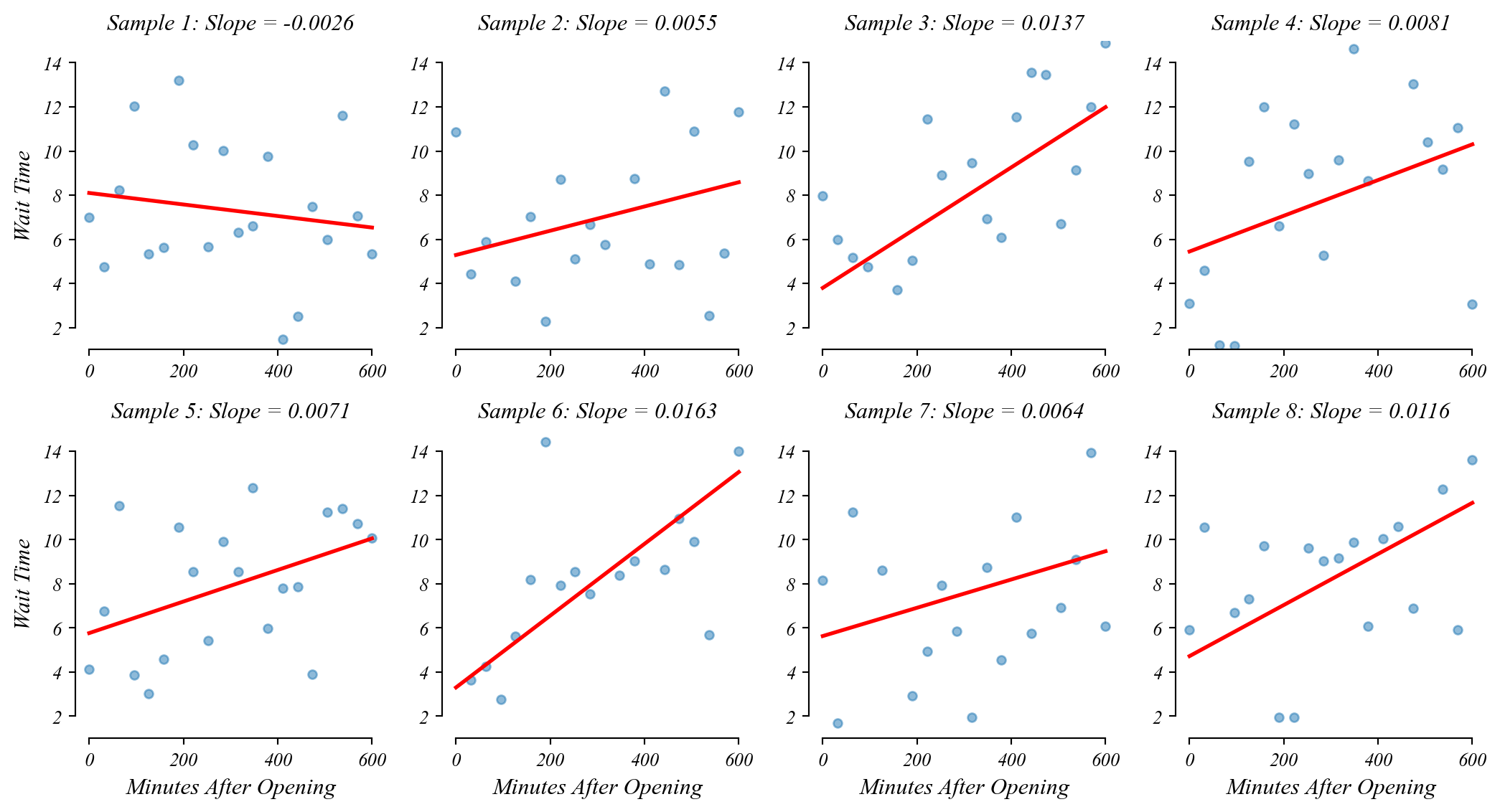 Like before, if we take many samples, we get slighly different slopes and slighly different fits.