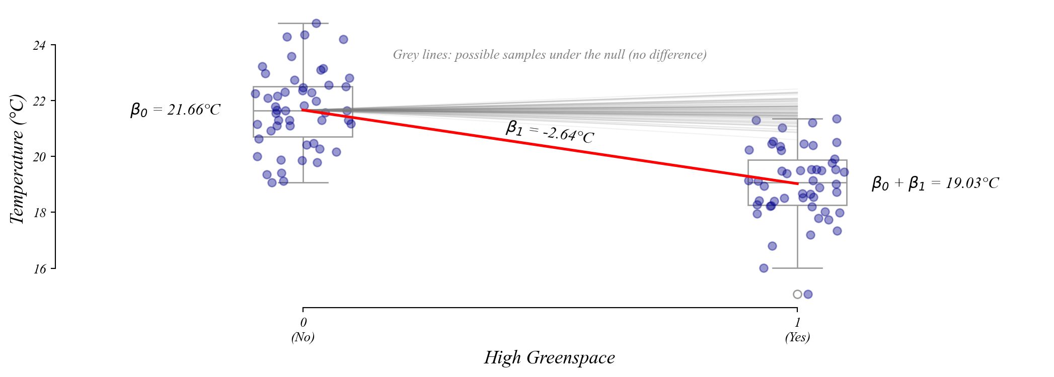 > Cities with Green Space (x=1) have a temperature that is lower by \(\beta_1\)