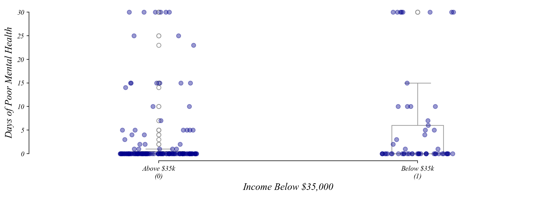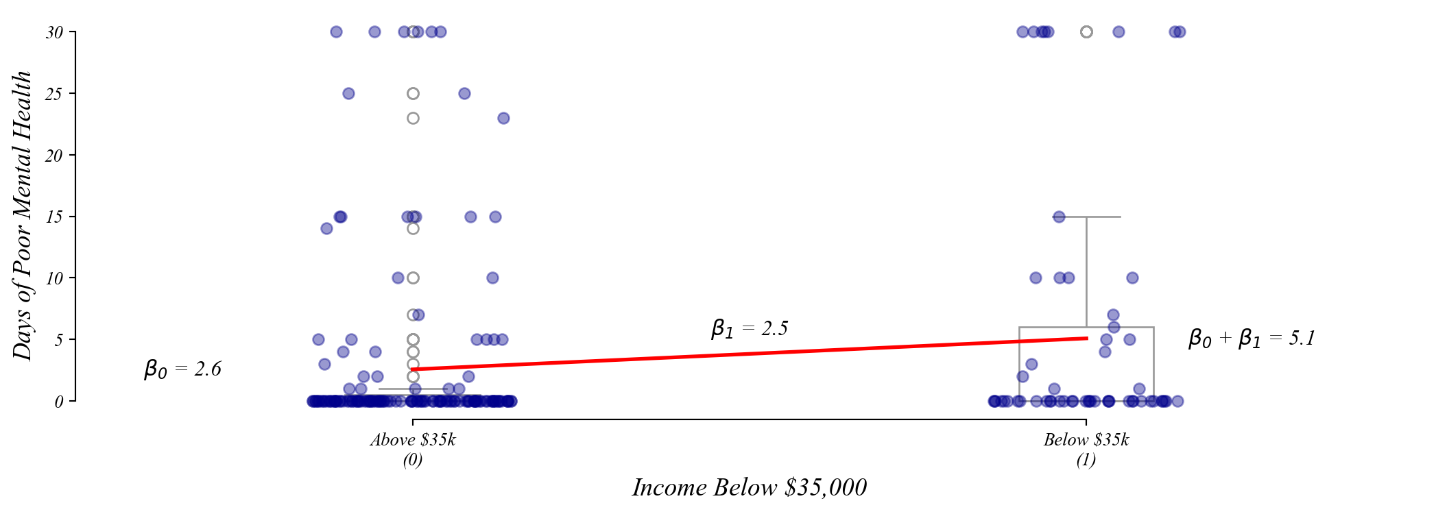> A significant positive \(\beta_1\) suggests those earning under $35k report more poor mental health days per month