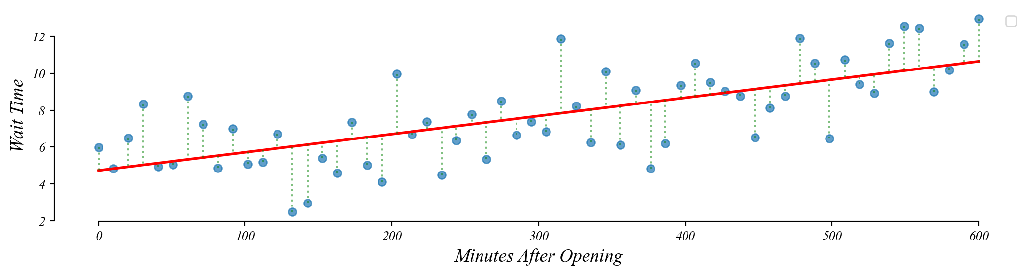 \[\text{WaitTime} = \beta_0 + \beta_1 \text{MinutesAfterOpening} + \epsilon\]