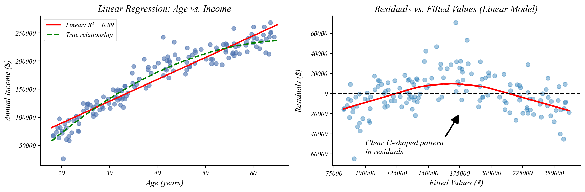 \[\text{income} = \beta_0 + \beta_1 \text{age} + \beta_2 \text{age}^2 + \varepsilon\]