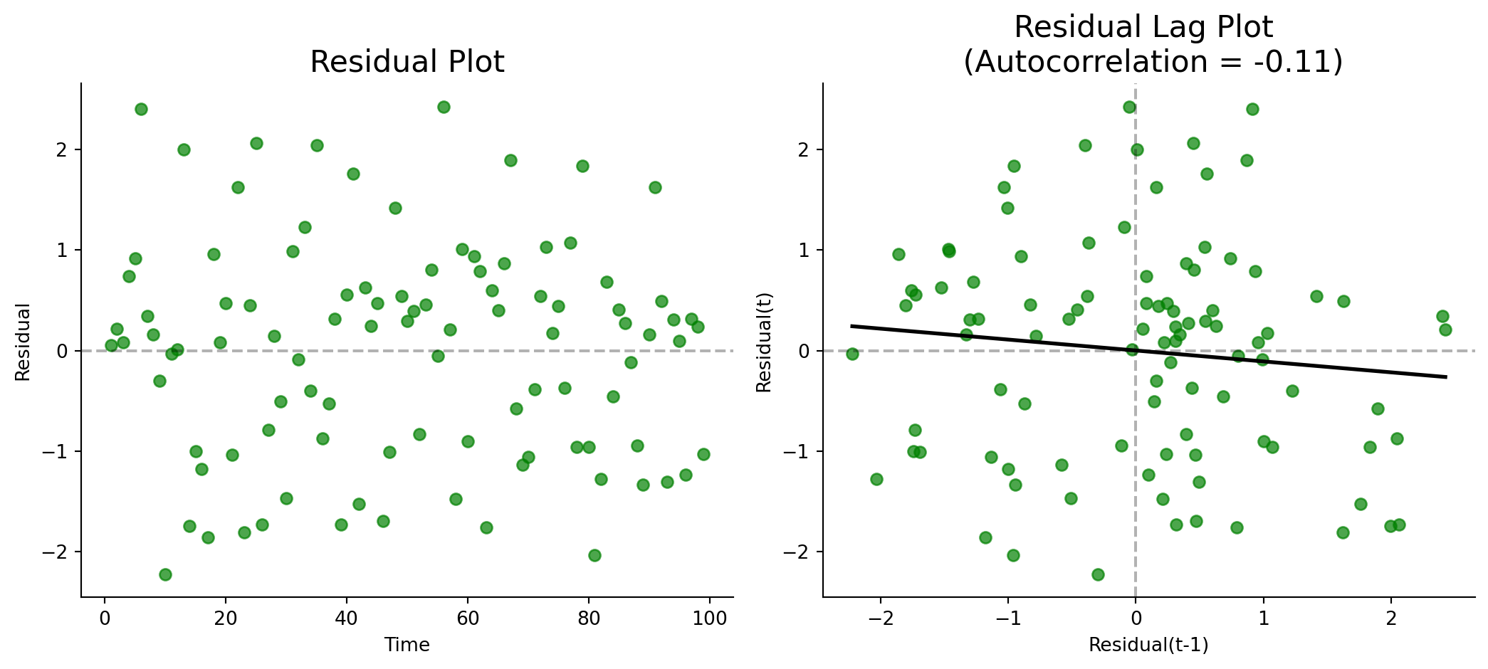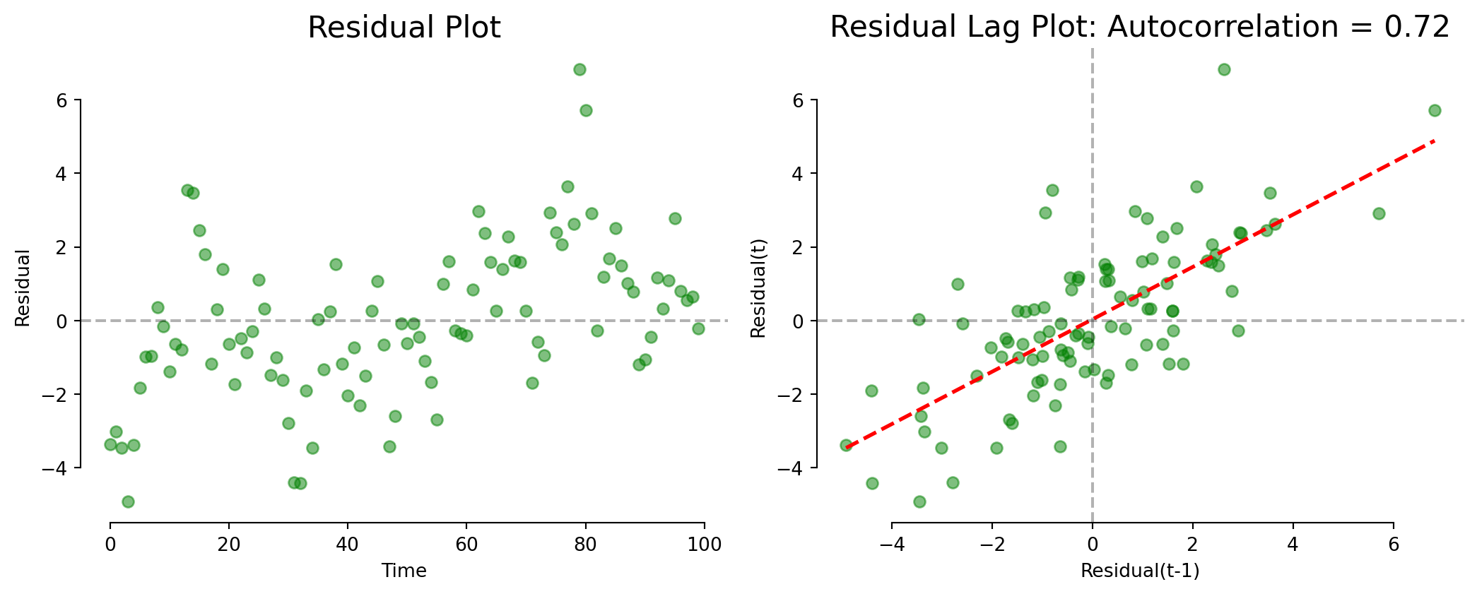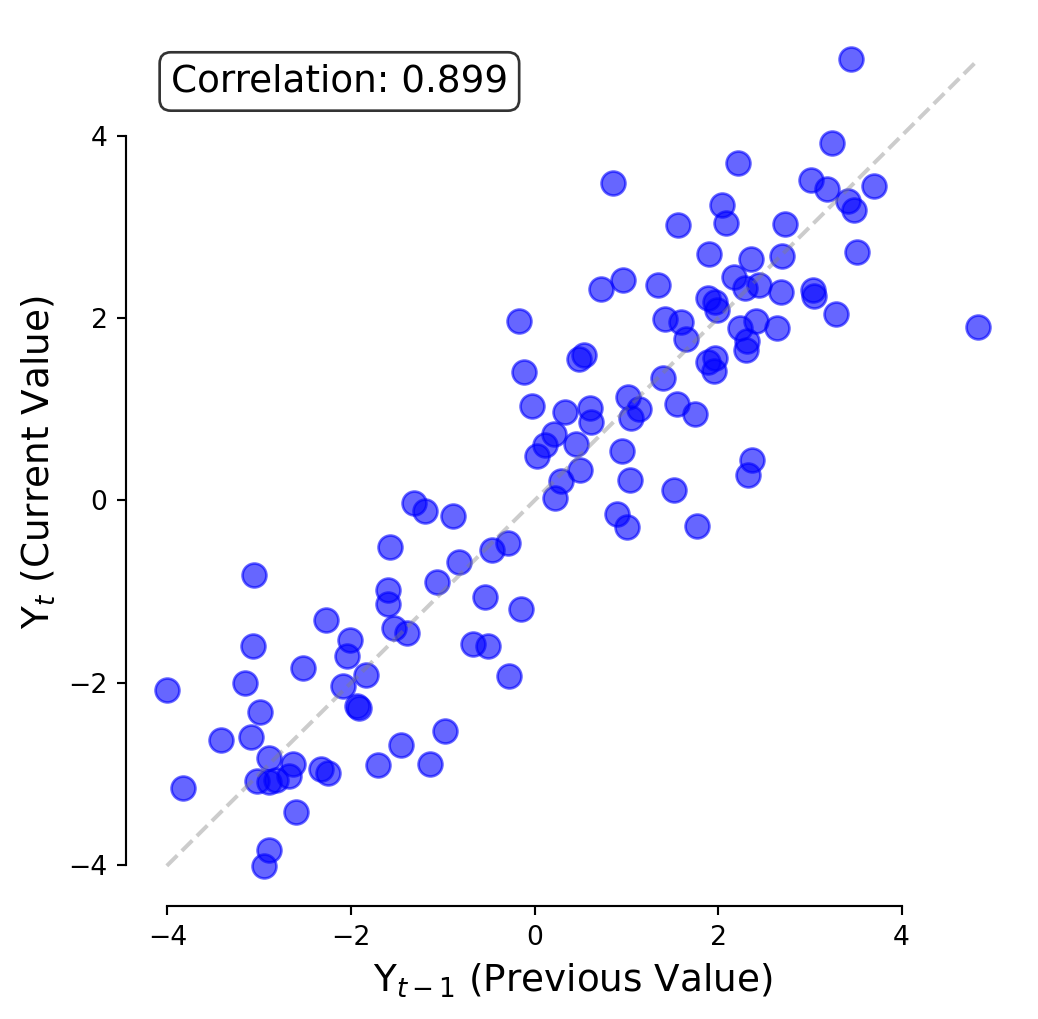 A Lag Plot shows the value today (\(t\)) against the value yesterday (\(t-1\)).