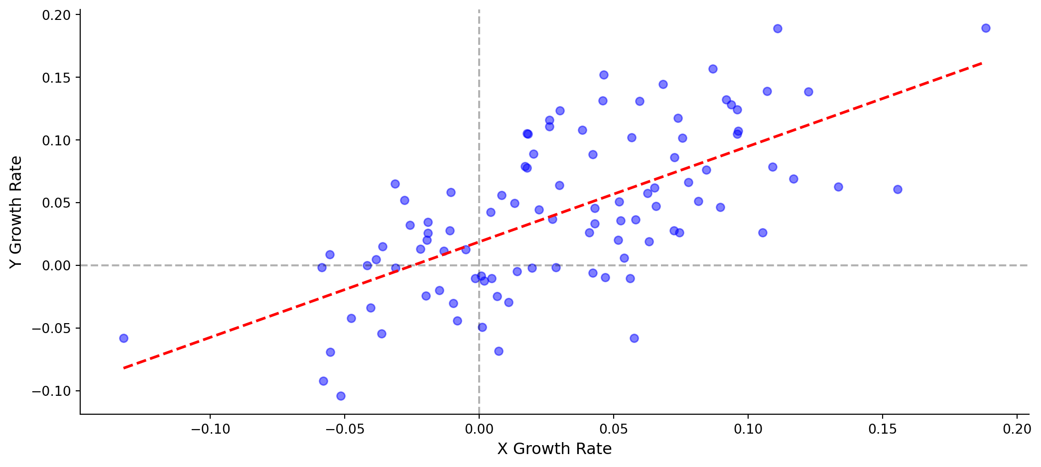 \[g_Y = \beta_0 + \beta_1 \times g_X + \varepsilon_t\]