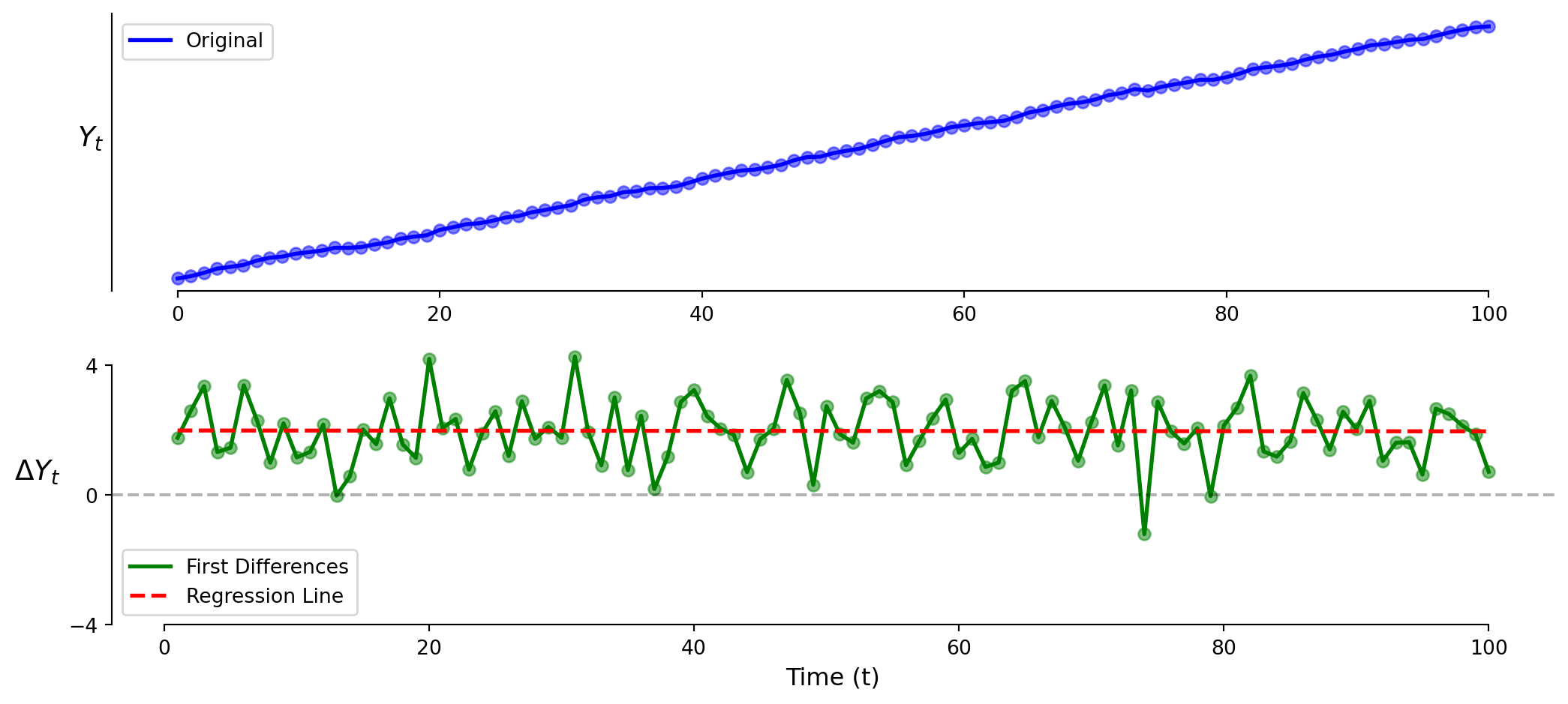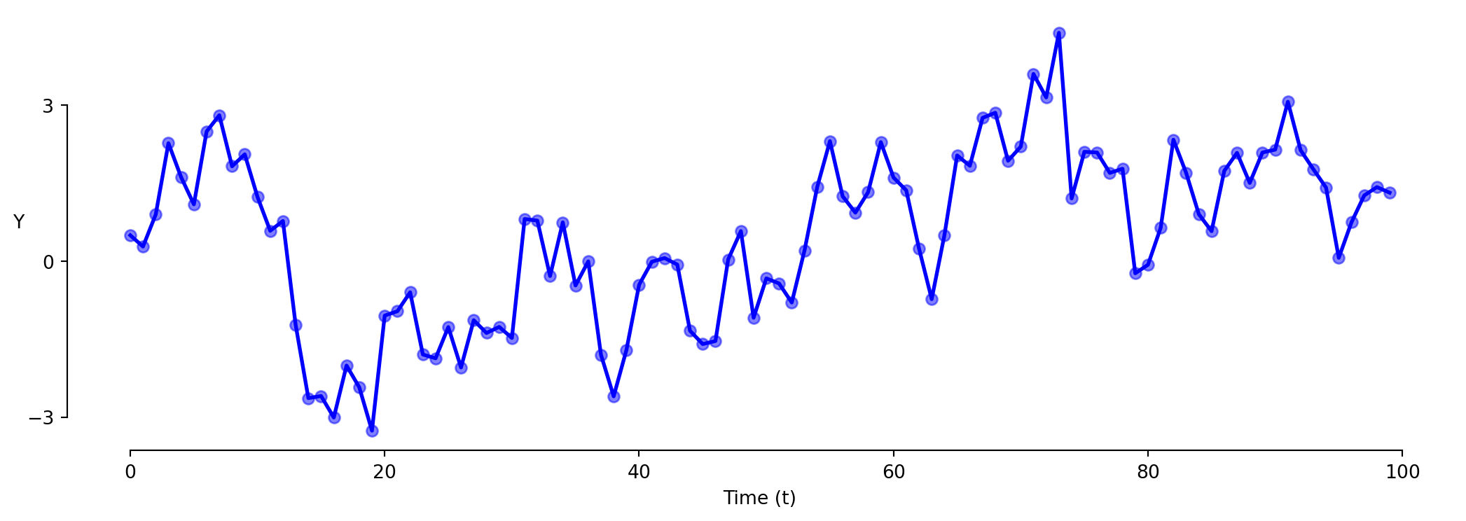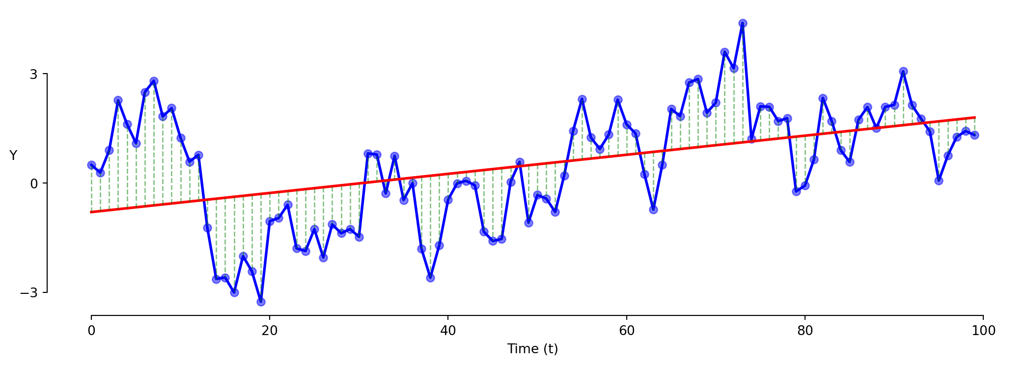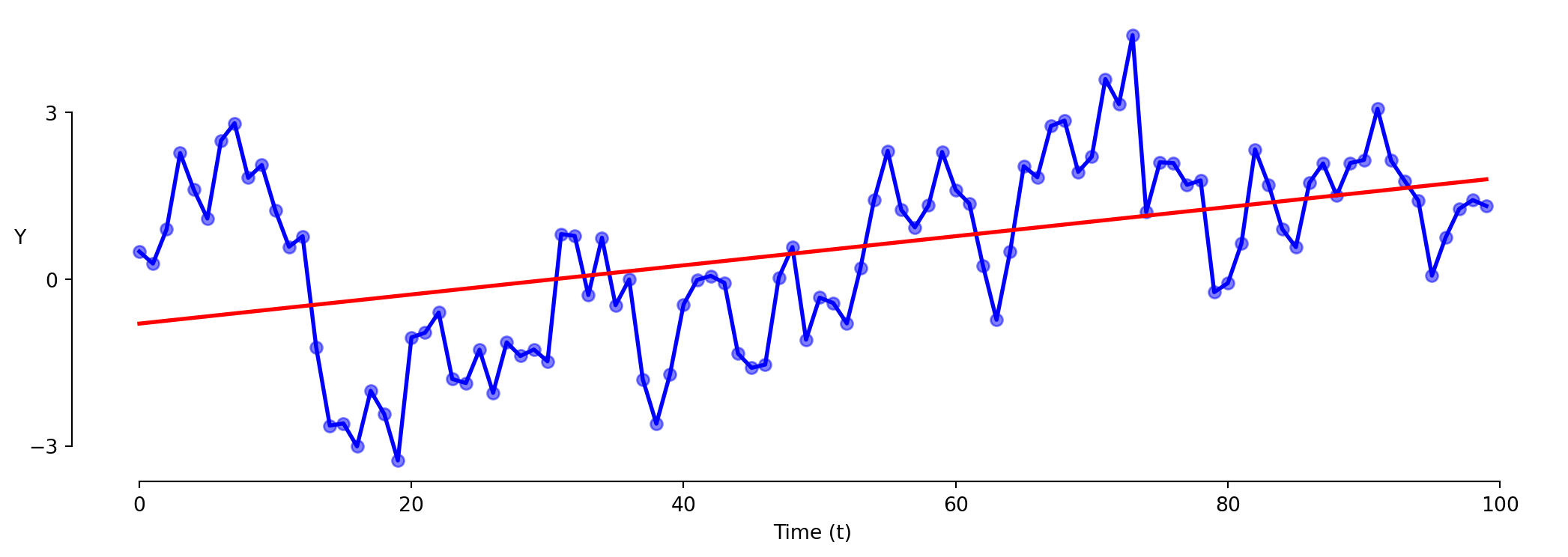 \[\text{Y} = \beta_0 + \beta_1 \times \text{t} + \varepsilon\]