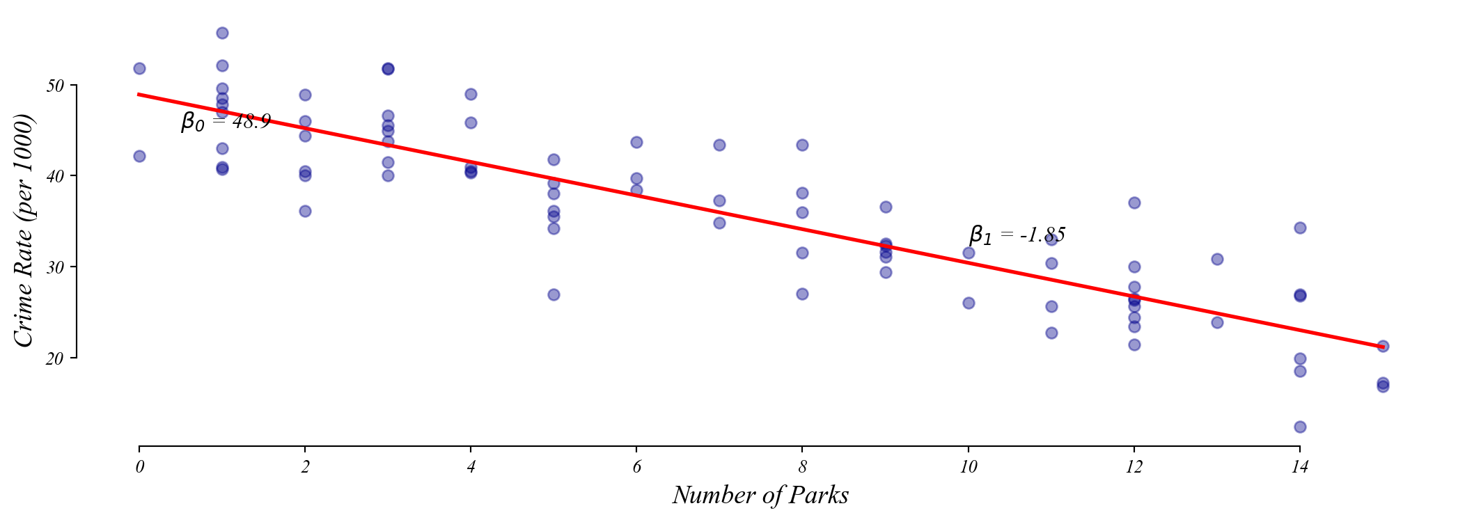 \[\text{crime_rate} = \beta_0 + \beta_1 \cdot \text{num_parks} + \varepsilon\]