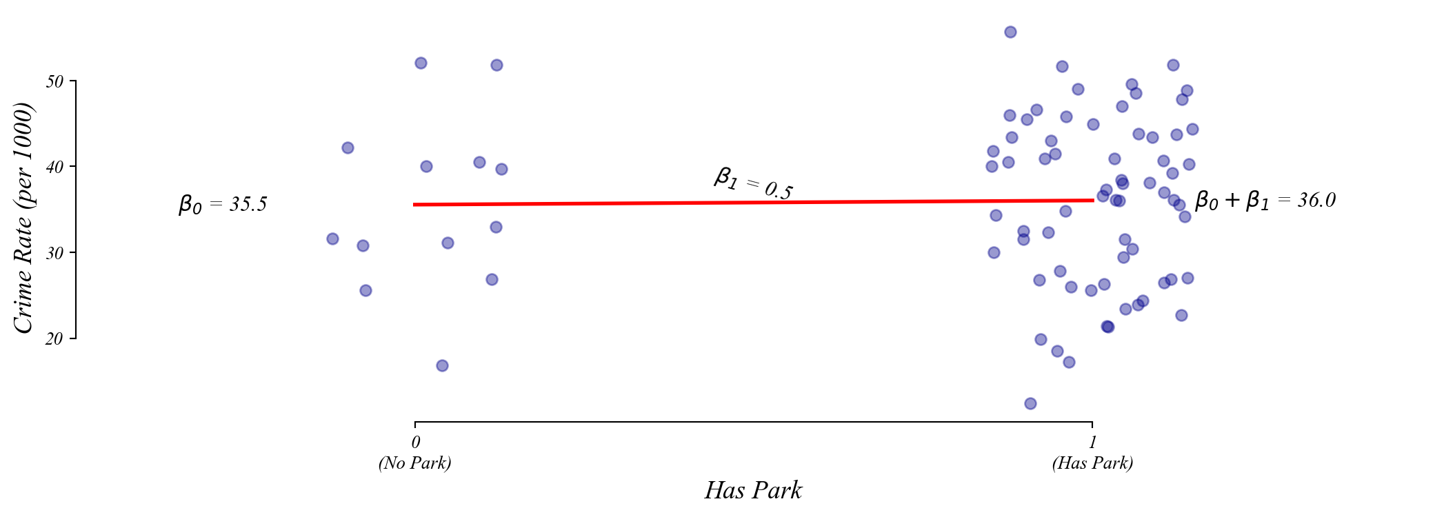 \[\text{crime_rate} = \beta_0 + \beta_1 \cdot \text{has_park} + \varepsilon\]