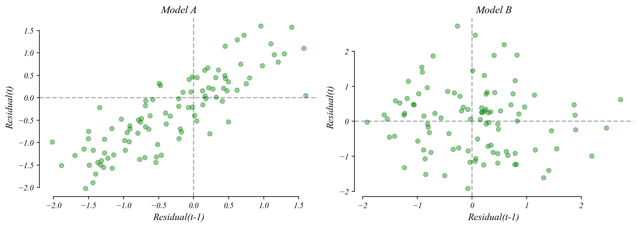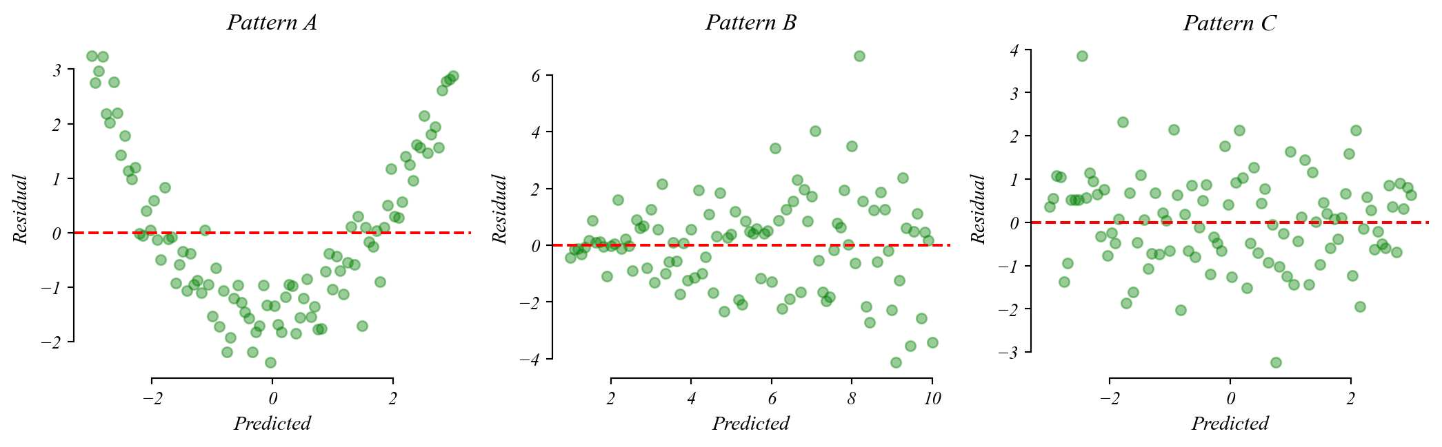 Which model assumption does each pattern suggest is violated?