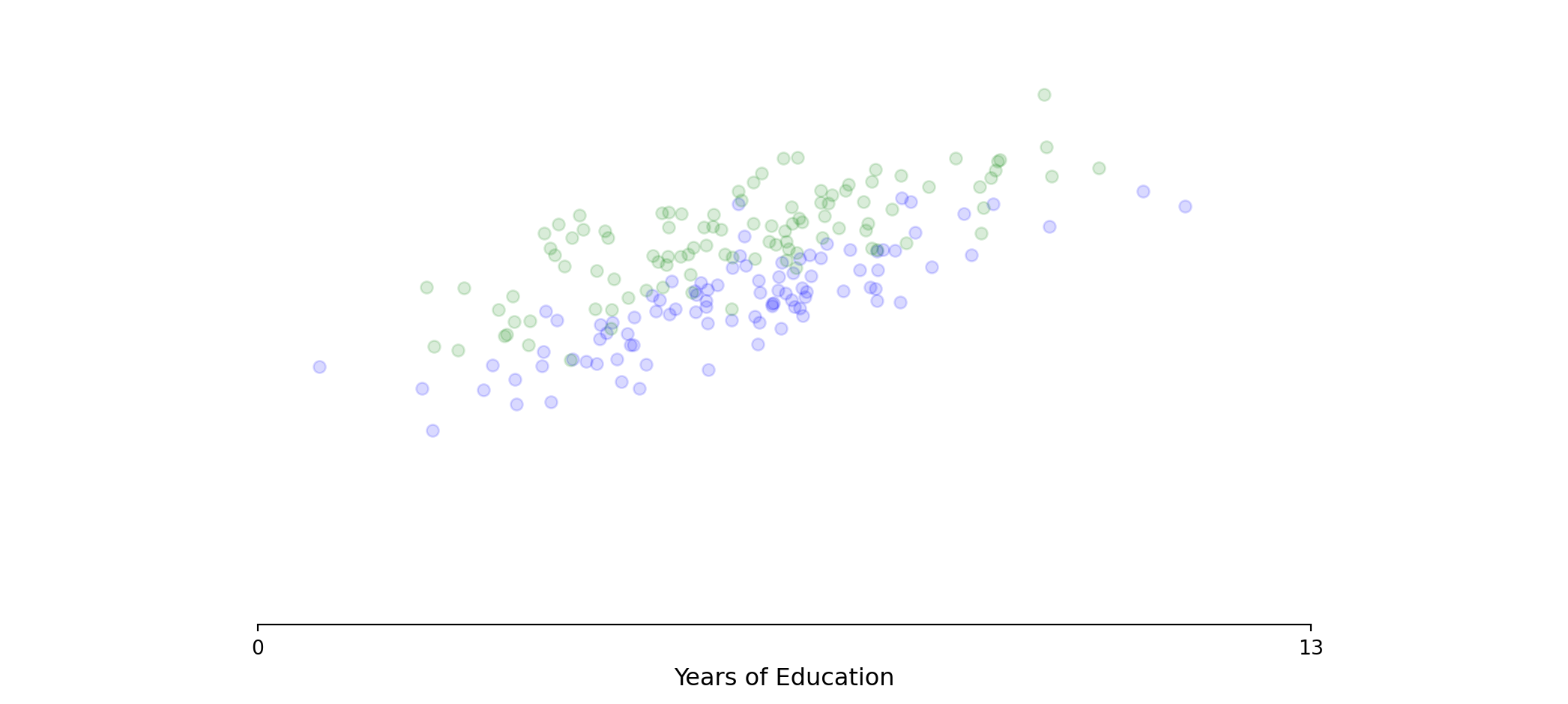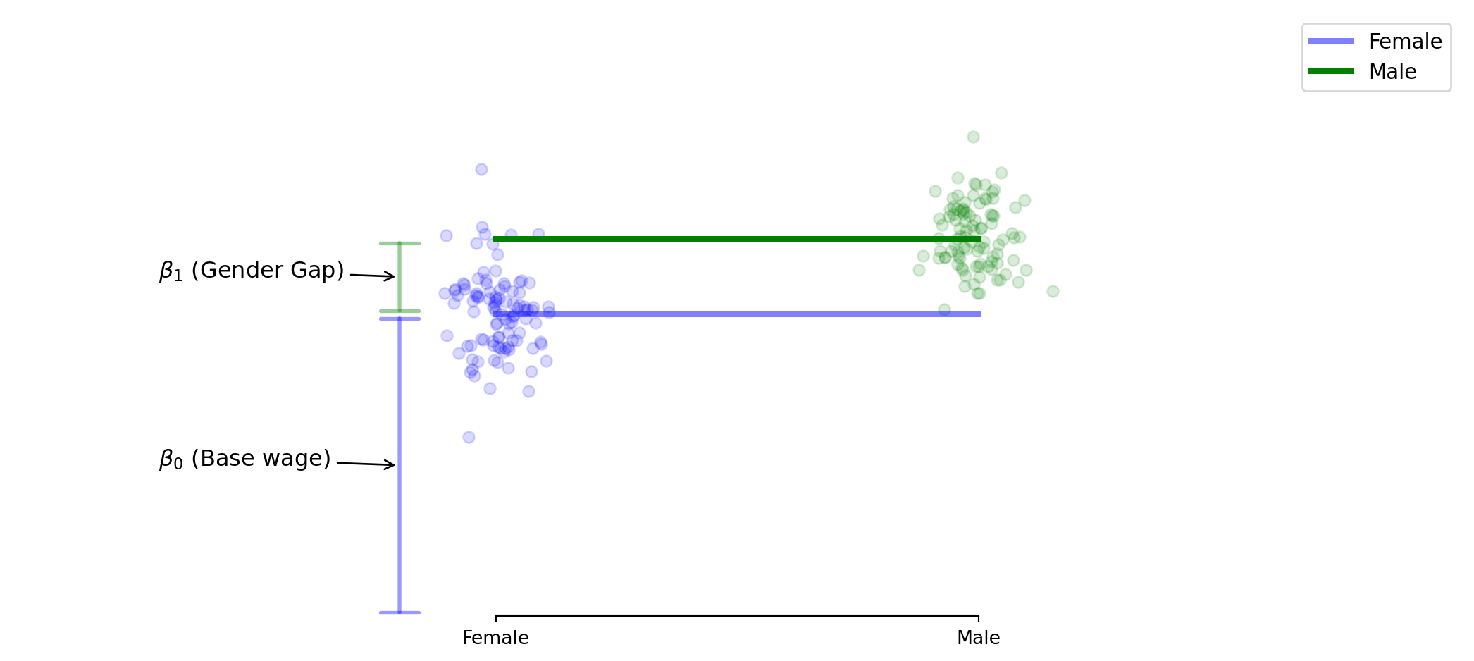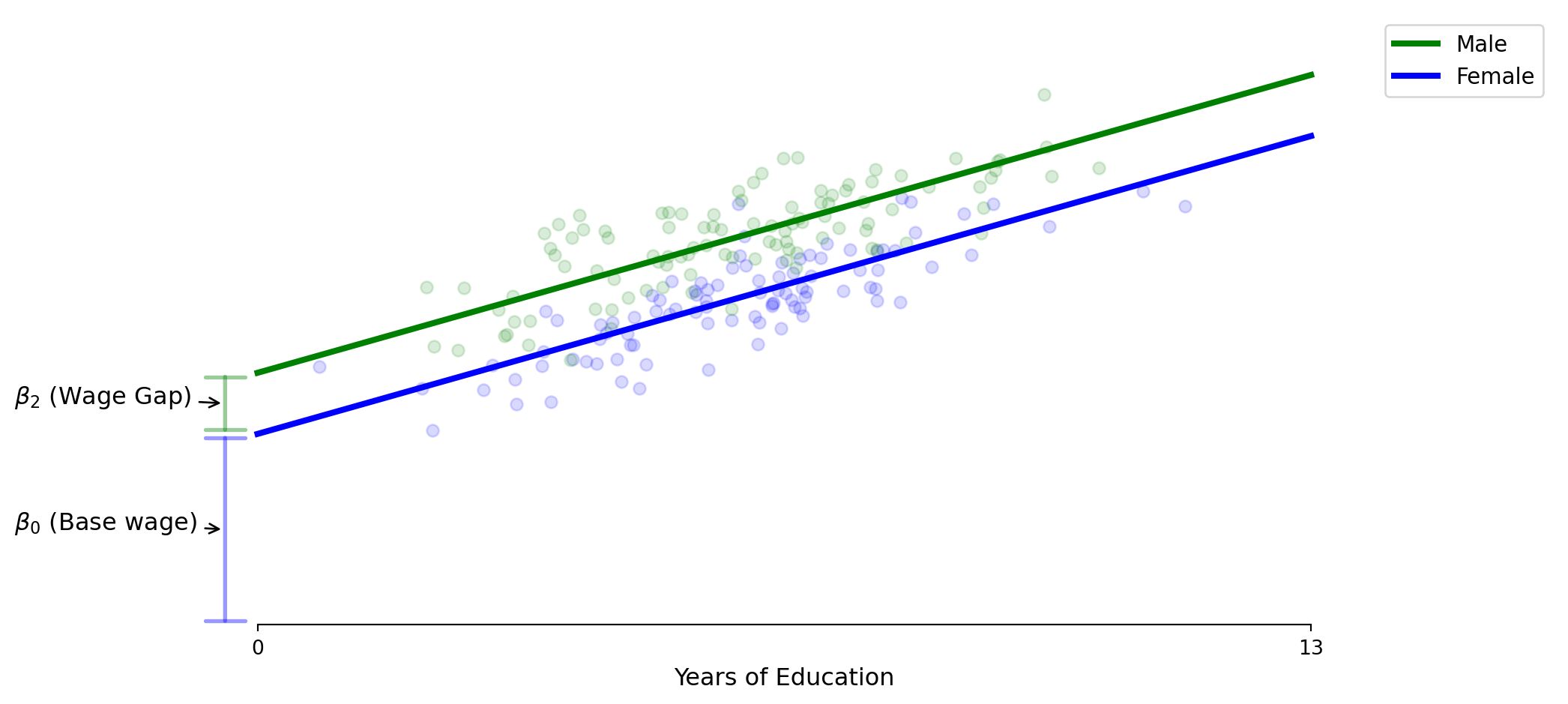 \[\text{Wage} = \beta_0 + \beta_1 \times \text{Male} + \varepsilon\]