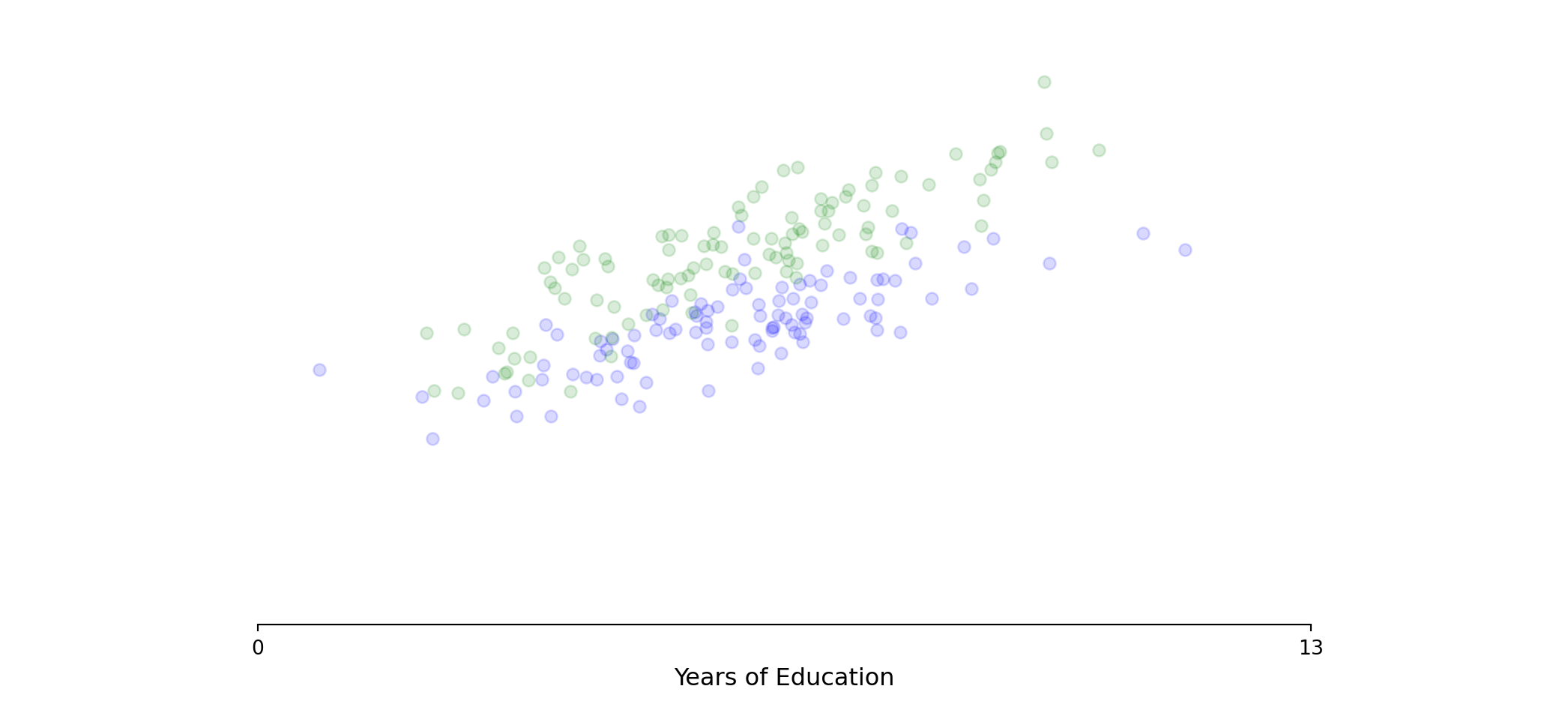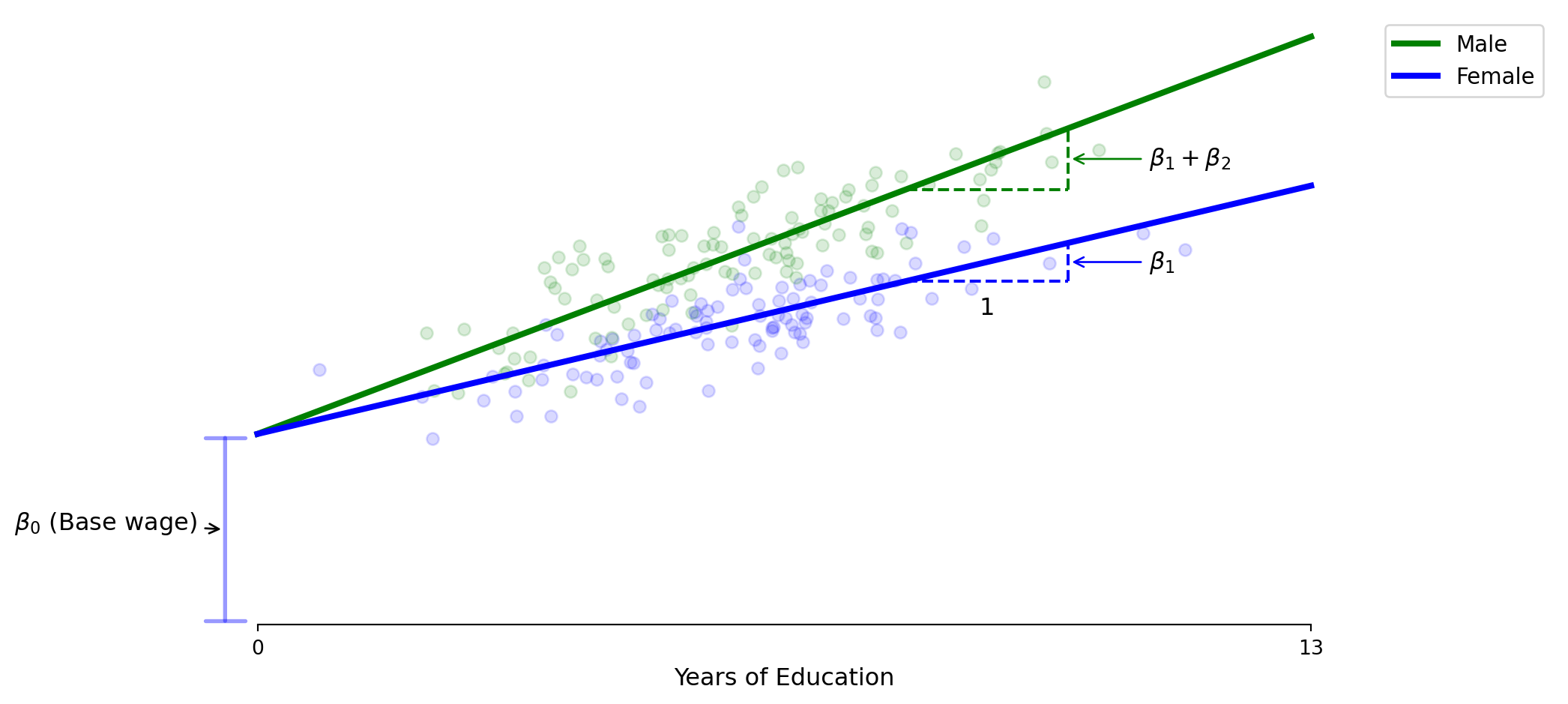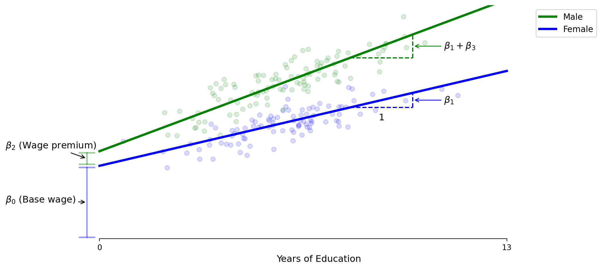 \[\text{Wage} = \beta_0 + \beta_1 \times \text{Education} + \beta_2 \times \text{Education} \times \text{Male} + \varepsilon\]