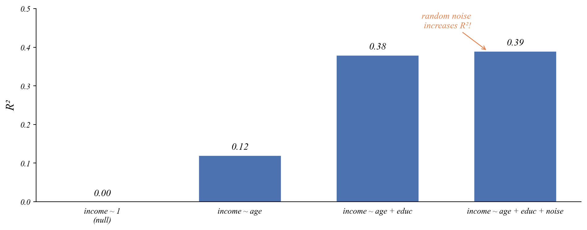 Every time we add noise, R² goes up a little. But only a little.